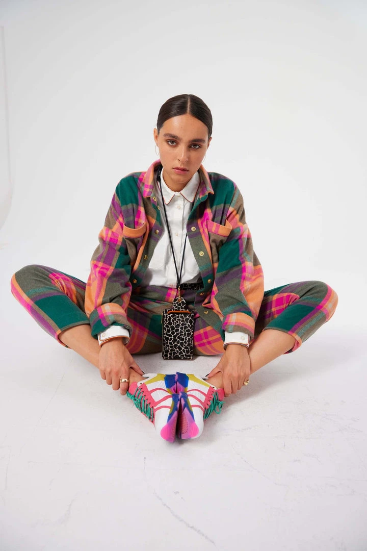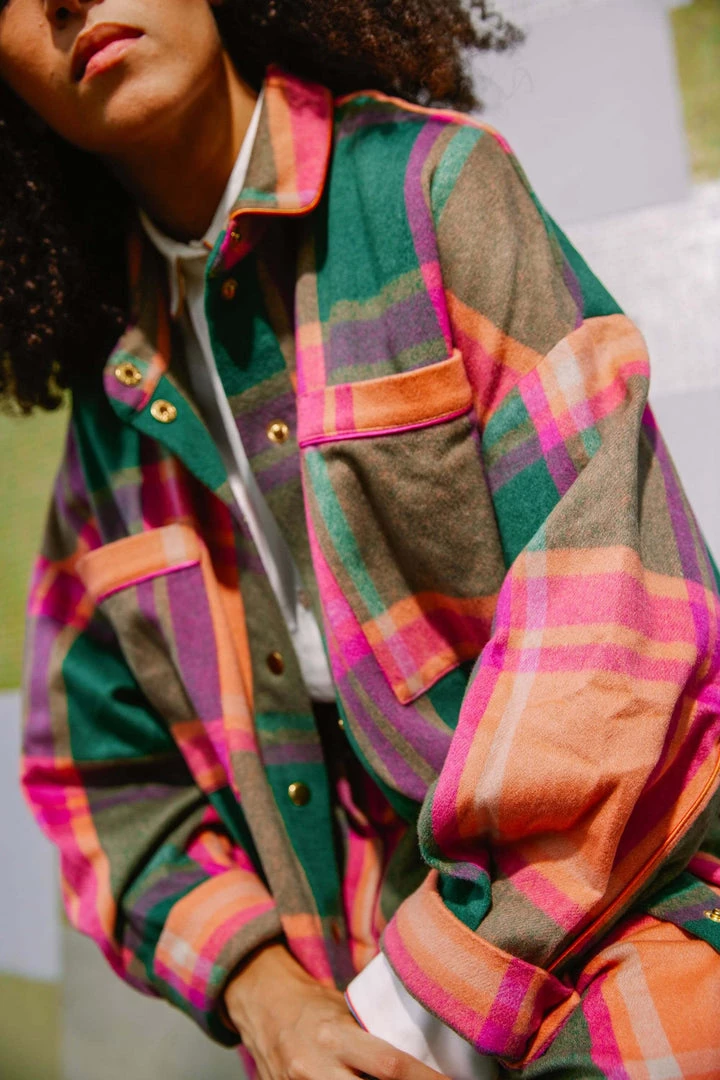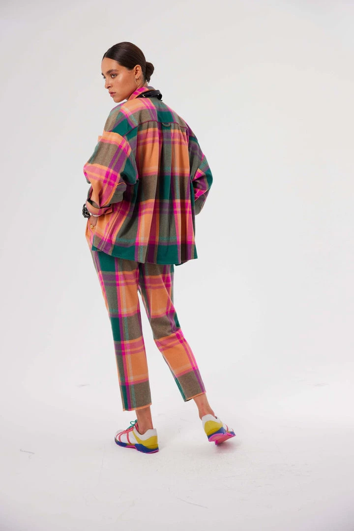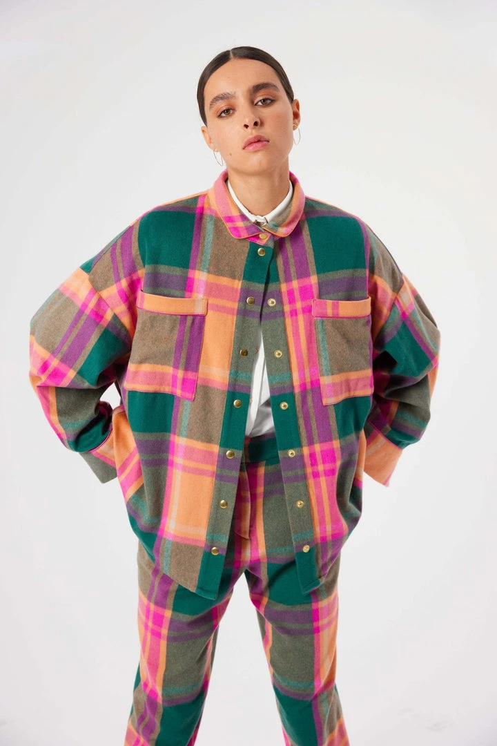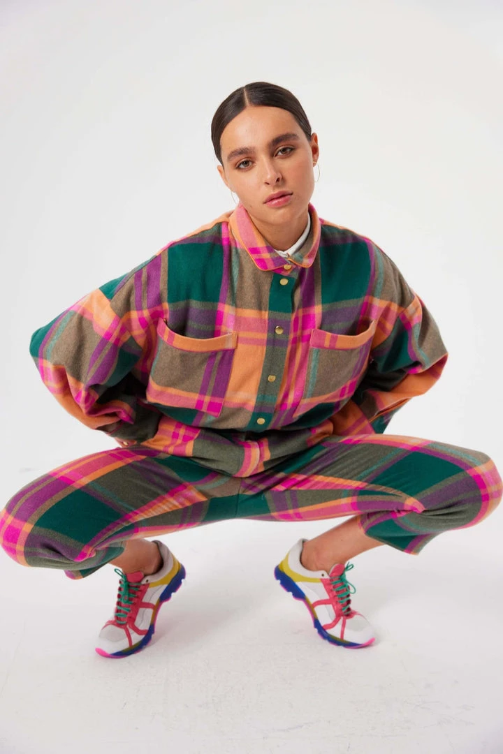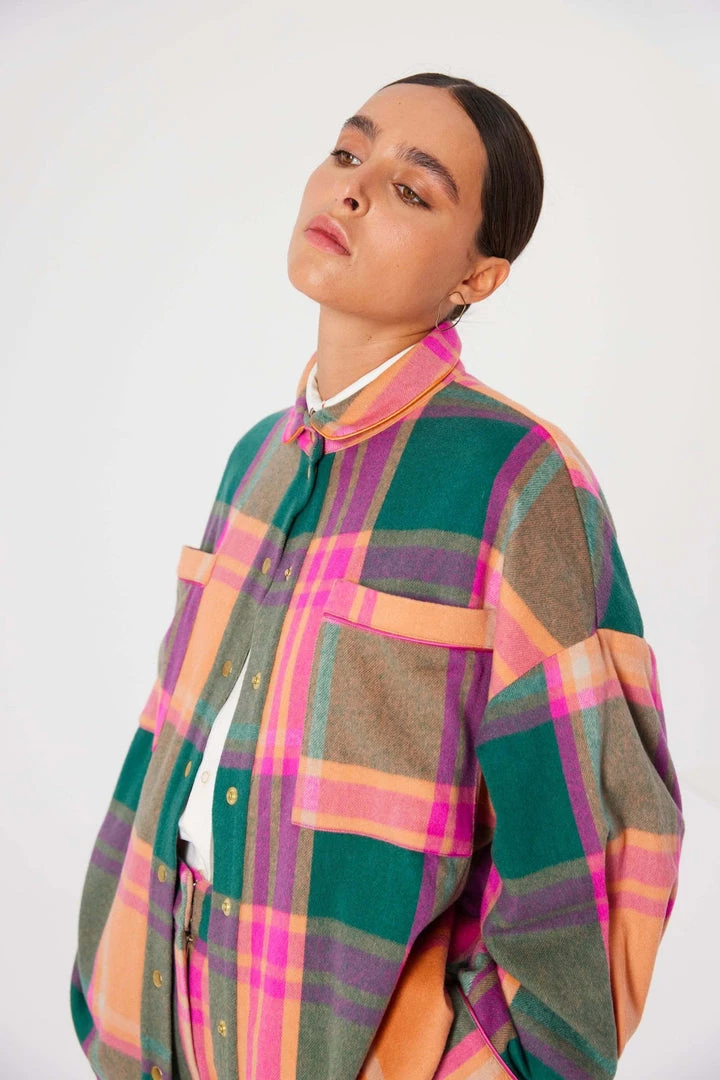 The Astrée shirt in Rhum District cashmere is colorful: the infused green is mixing with the sweetness of pink, giving us the intense impulsion of the tartan. The piece has an oversize and cozy cut, fitting to a festive, casual or even a chic atmoshere. Echoed by its oversized side for comfort and its cashmere softness it has a wispy fit with a droopy, wide armhole. The cuffs are wide, surrounded by orange and pink piping.
