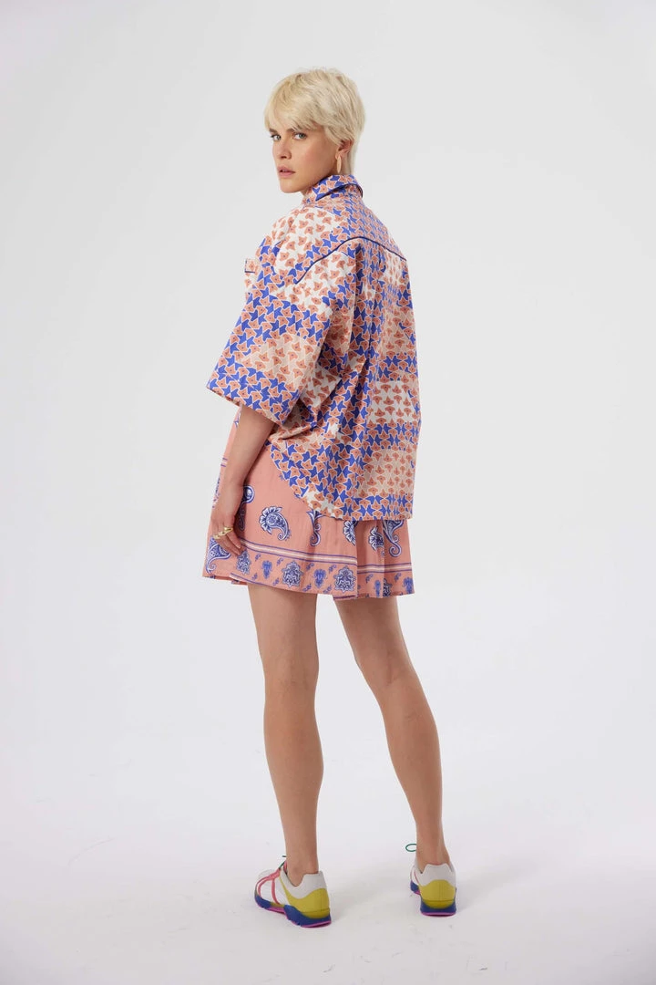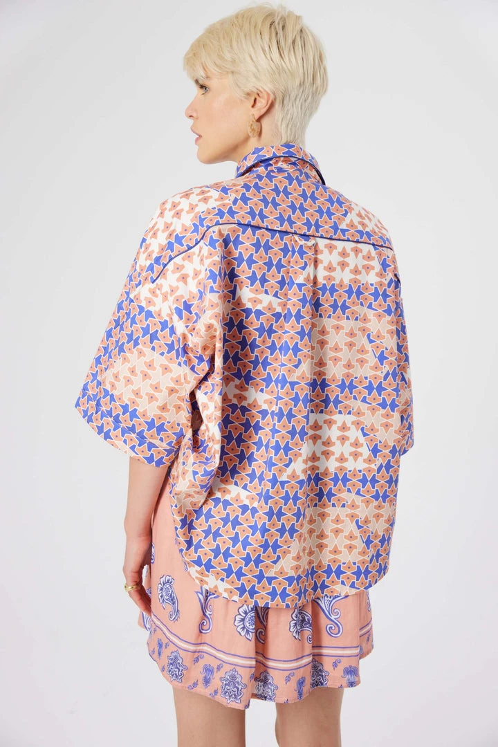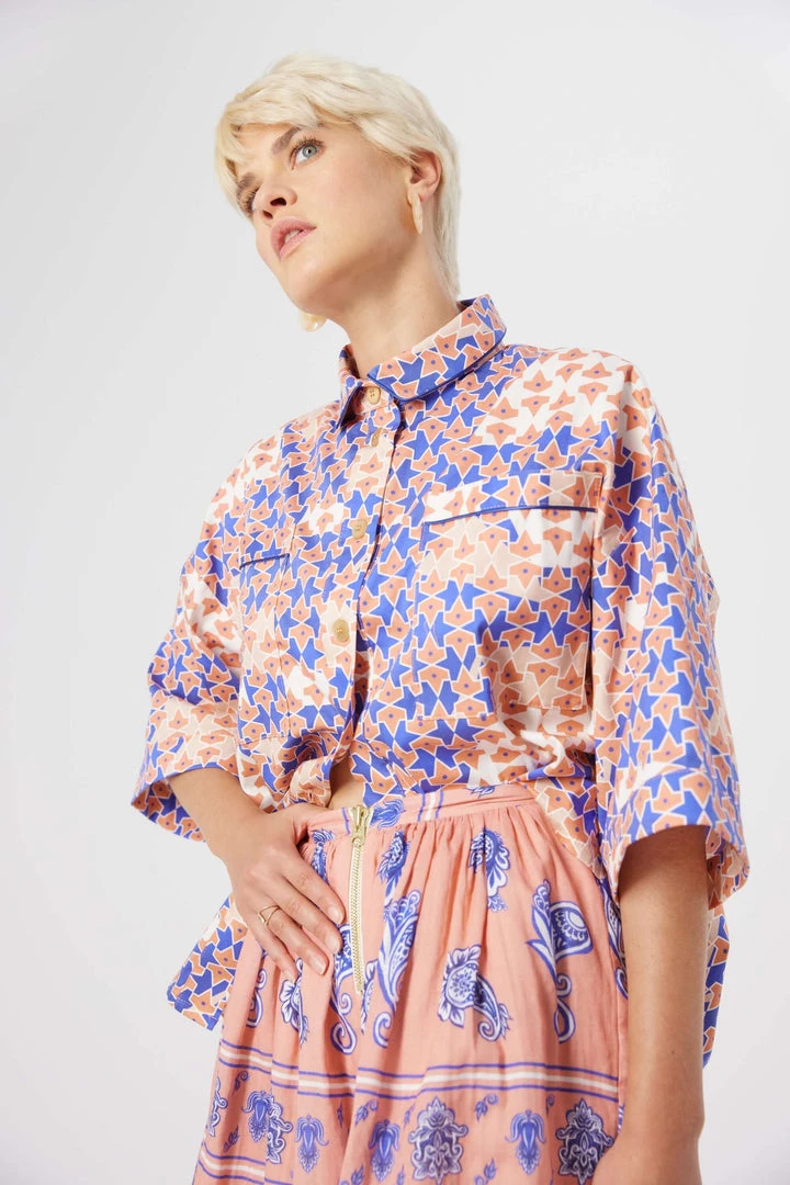 Made in a structured and thick cotton, our newest Astrée shirt is declined in a colourful and catching pink and blue mosaic. Strong and feminine, it features a masculine collar, two chest pockets and 3/4 low sleeves. The rich and sophisticated design is subtly enhance with the blue piping of the collar and the pockets.