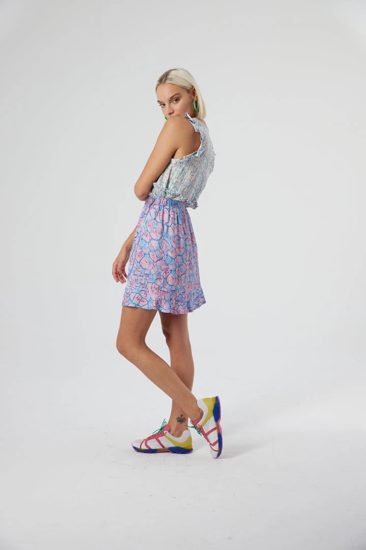 Crafted in a soft and silky viscose, the Austria skirt in Poolside print completes your outfit and sublimates the combinaison of ocean blue and saturated pink. Made with a waistband with elasticated sides for maximum comfort, it features a wrap-around cut with flat ruffles, making it sophisticated.