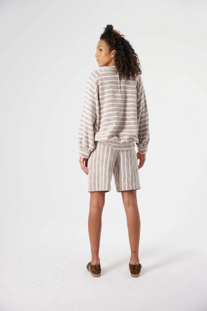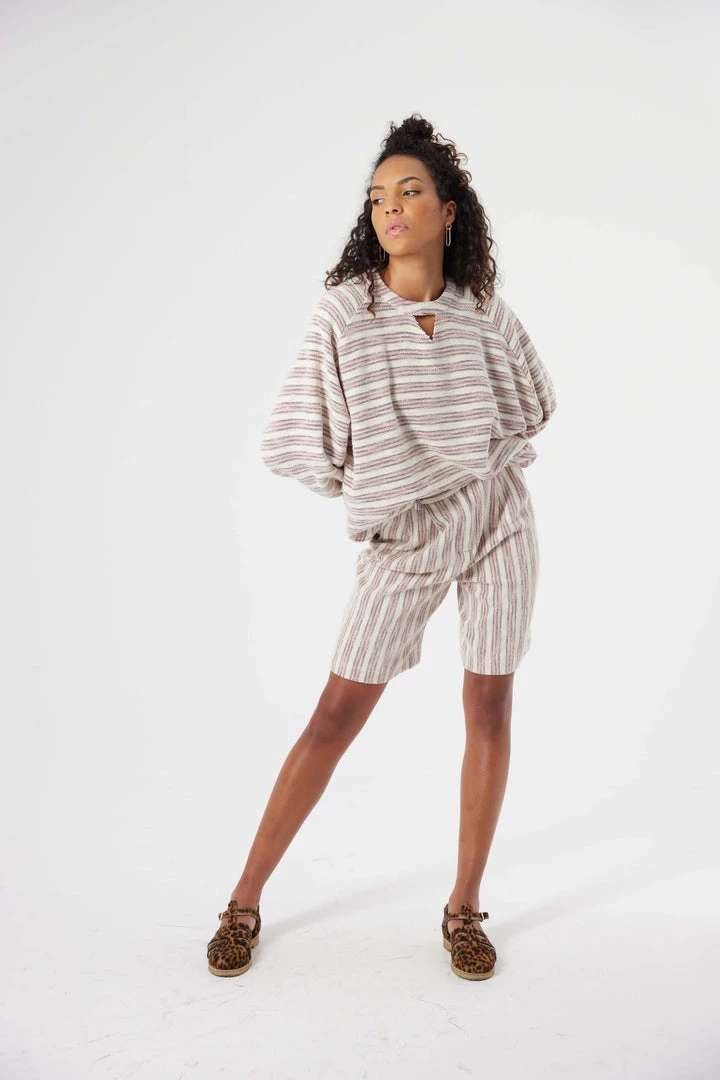 This new version of the Brooklyn jumper takes on the captivating auras of Mississippi with this duo of off-white and pink stripes. The blend of hemp and cotton weaves is very soft. Designed to inspire a quiet yet urban vibe, the jumper has wide sleeves and a triangle shape cut on the bust, a distinctive feature of this piece.
