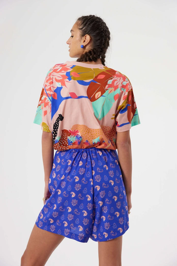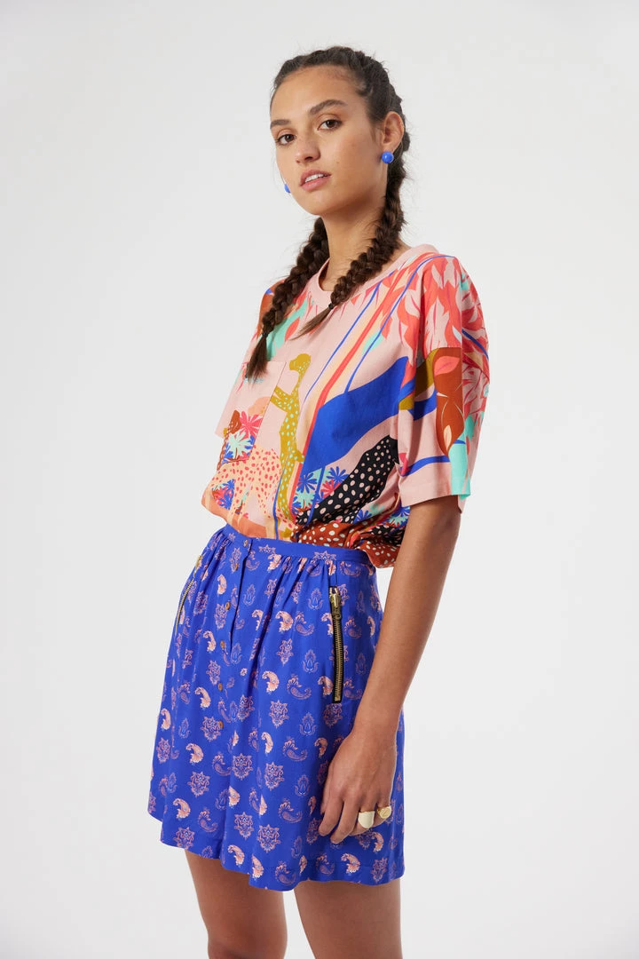 Here is our new model in our Heimstone collection: the T-shirt Dede. A well-cut and loose t-shirt is always a must in a woman’s closet. This summer Heimstone wanted to present a classic piece with a colorful print created by Heimstone. Every piece has its own pattern, placed differently so that everyone can have a unique version of the Dede t-shirt.