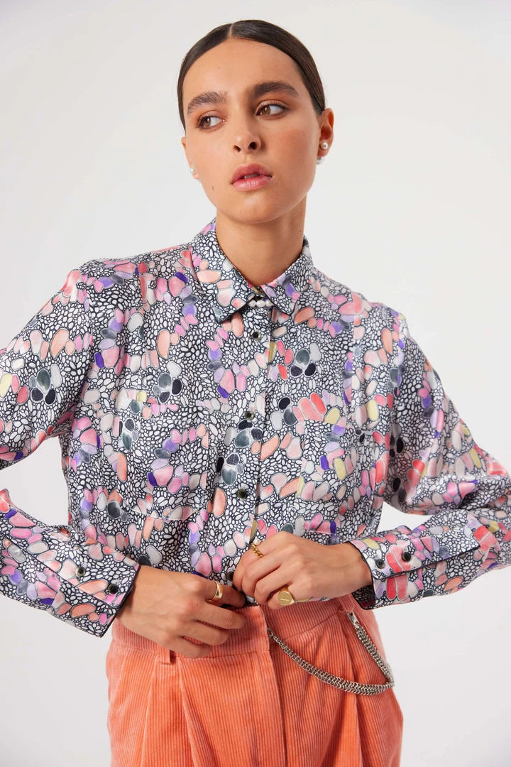 Our Dori shirt, a Heimstone iconic top, is for this oriental capsule, declined in a gourmand and soothing Mochi print. Inspired by men’s shirts, it features a strong masculine collar and fits well with the delicacy of this wise and quiet posture of the bust. Design in a loose cut but adjusted shoulders, it emphasizes your figure in a refined way, while giving an elegant and subtle look. The fabric has a satin feel with a glossy finish. The fabric is slightly thick giving an enveloping as well as a flowing fall at the same time.
