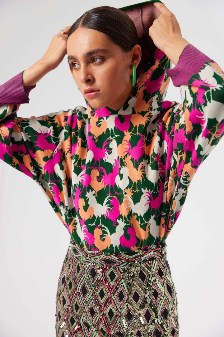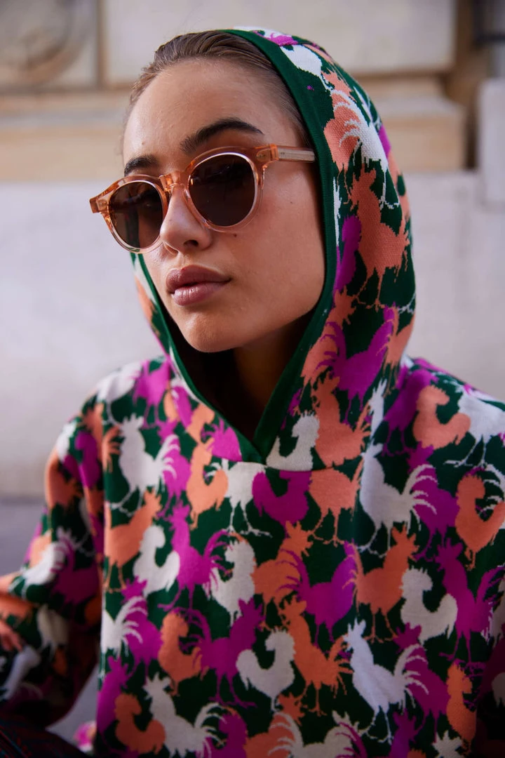 Declined in an explosion of orange, green and fuchsia shades, find out our Drew sweater in Coco knit. Designed with illustrated and graphic roosters, the Drew sweater embraces this streetwear side and will become your clothing cocoon. Made in a stretchy and thin knit, it will keep you warm with style and relaxation. Its loose cut and its fitted hood generously cover your body.