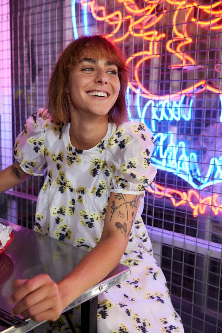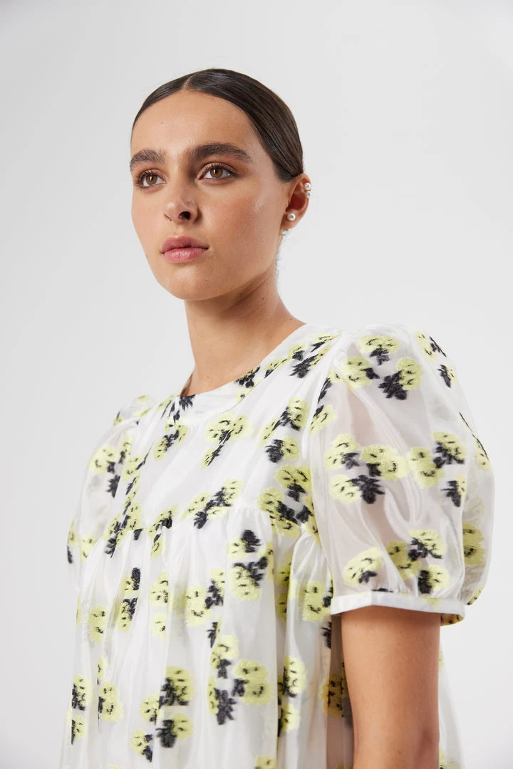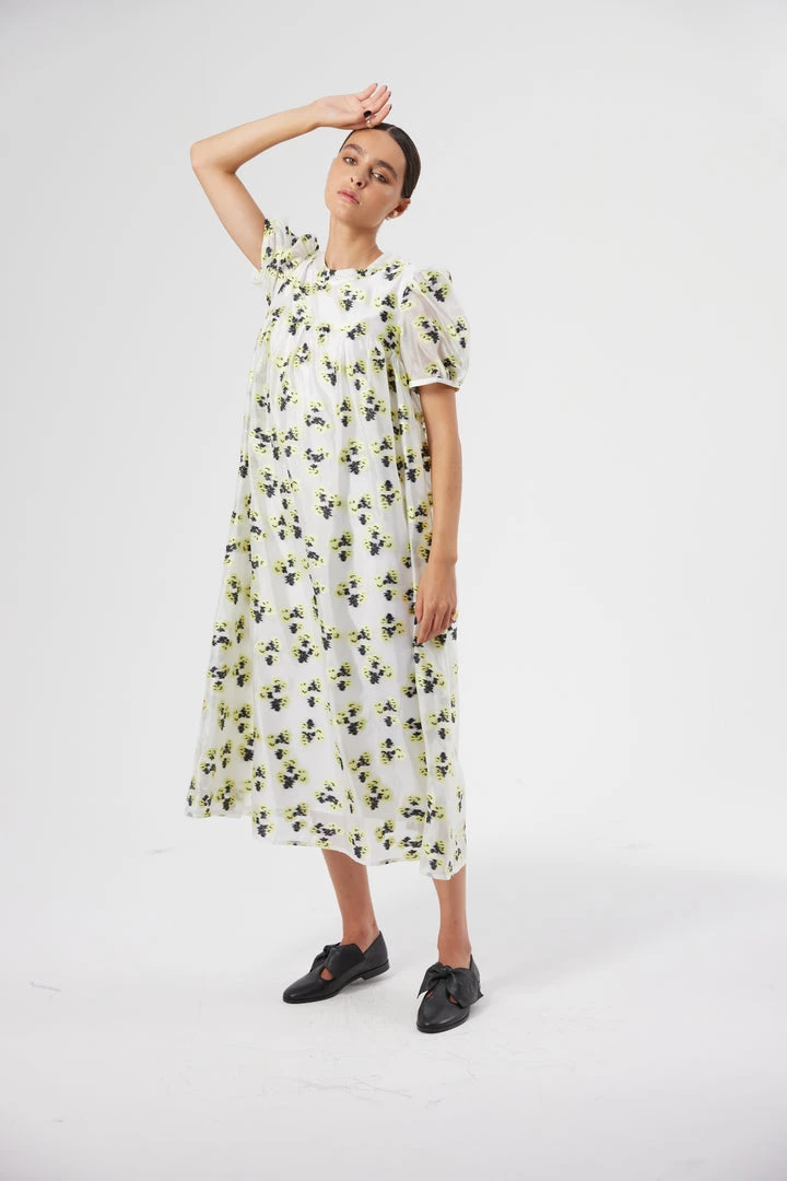 Romantic and sophisticated, the Gaya dress provides a straight and long fall to a silouhette, anchored with gossamer and puffed sleeves. Made in an airy and delicate organza drape, the soft lining adds a vaporous and quiet volume and let the dandelions blossom and stand out more. For a classy design, it features a series of buttons at the back.Â