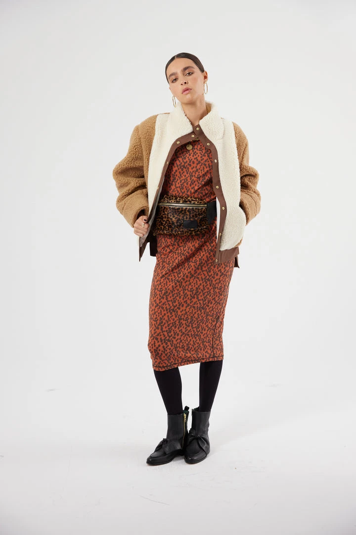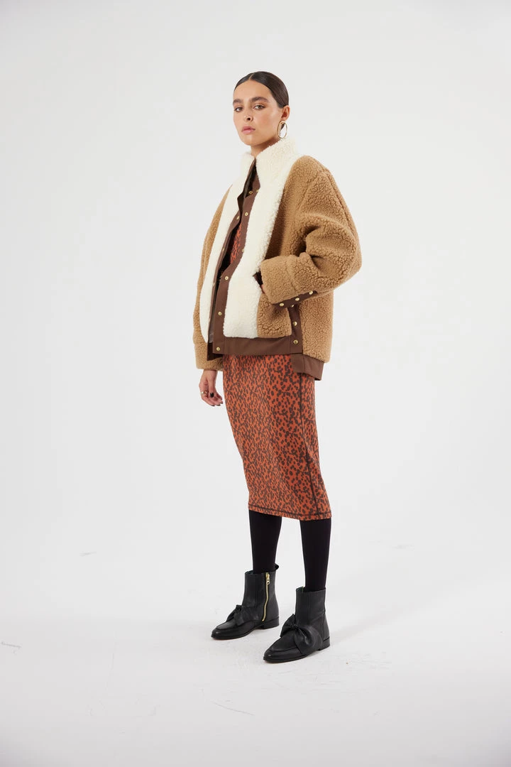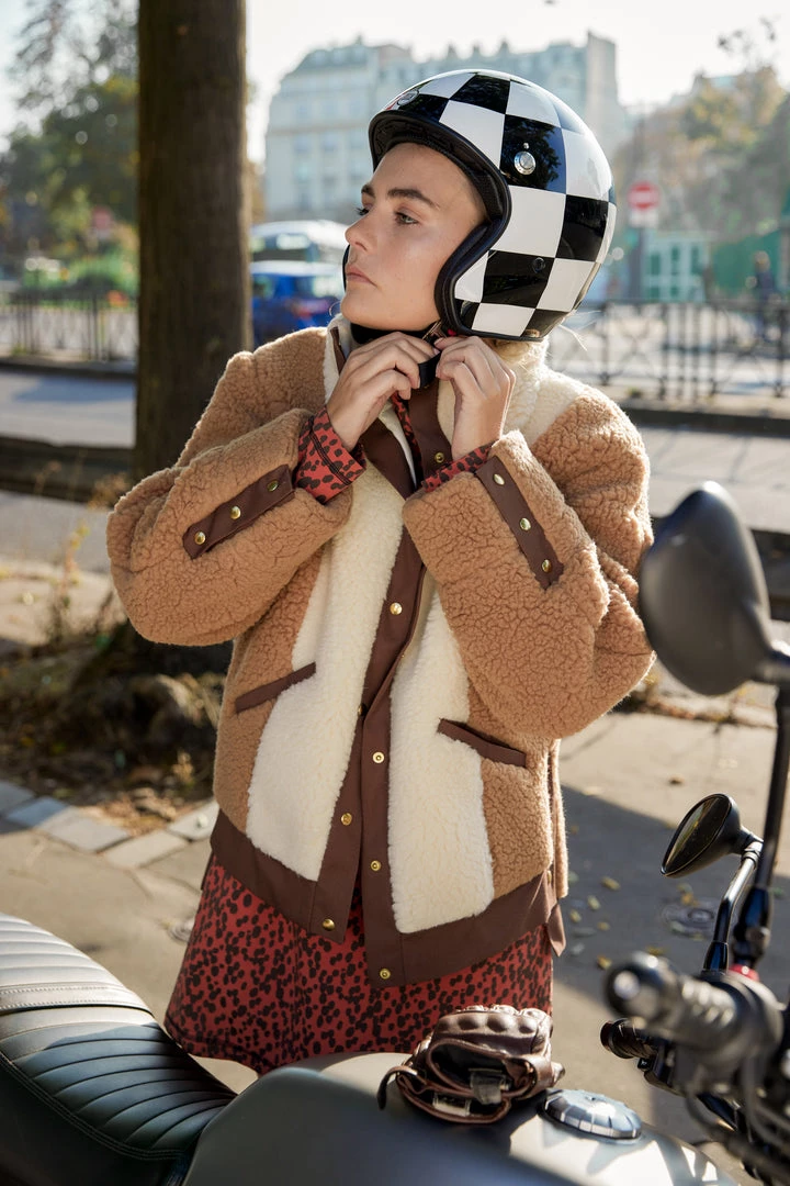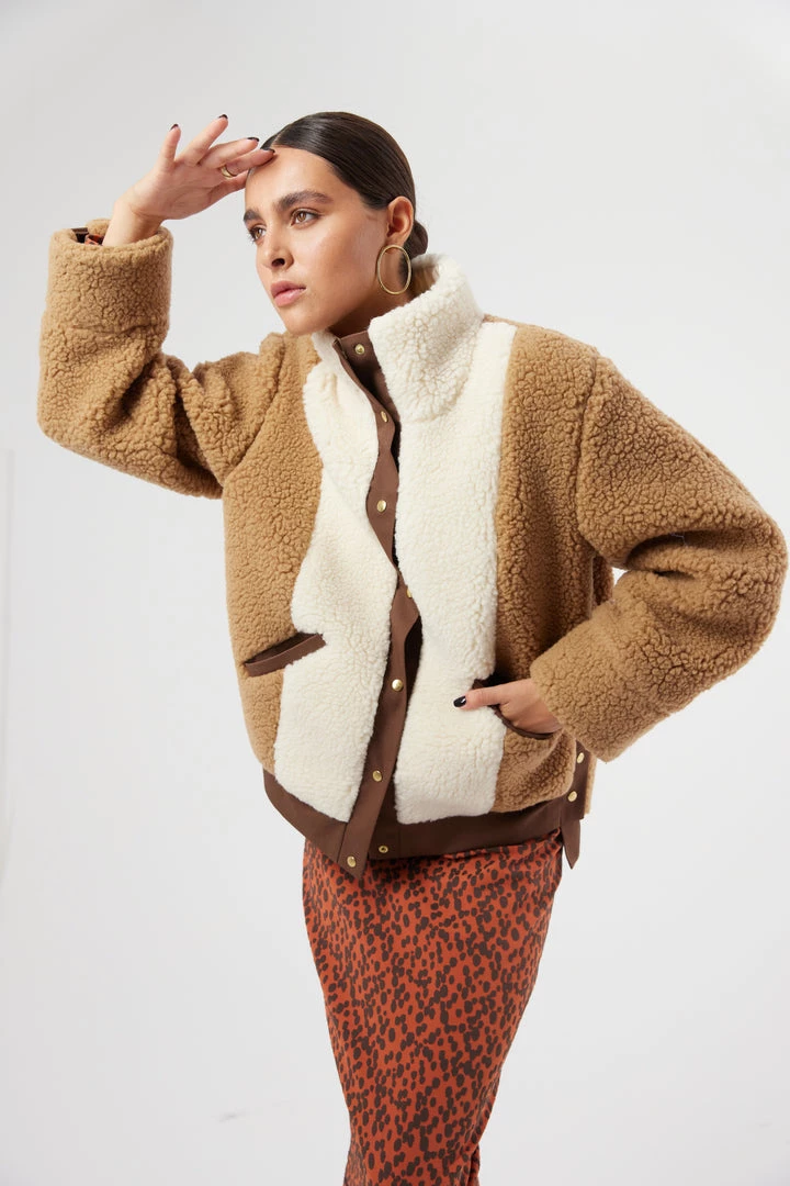 The Idol jacket is declining itself in a tricolore neutral tone. Part of Heimstone’s signature collection. It is a stylish short jacket. Once you have it will feel fluffy and have an oversize effect. It is a winter jacket with a unique piece thanks to its high neck collar and its asymmetric shape in beautiful cream, coffee and chocolate colours and natural wool.