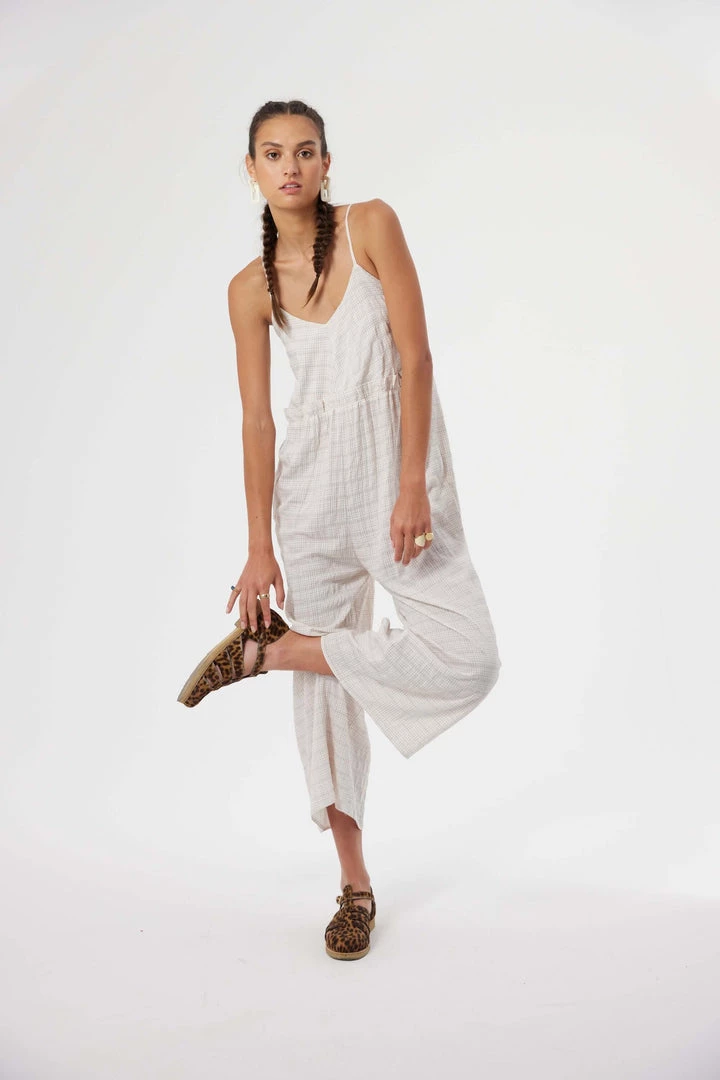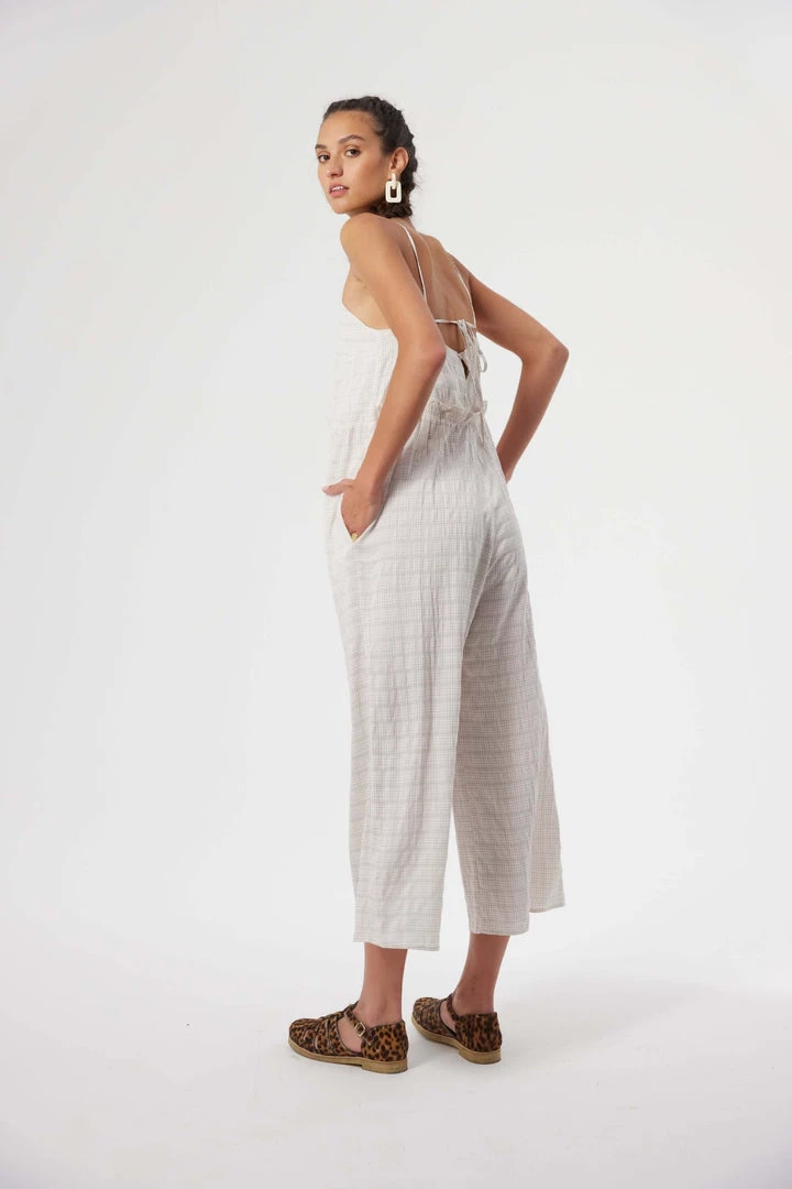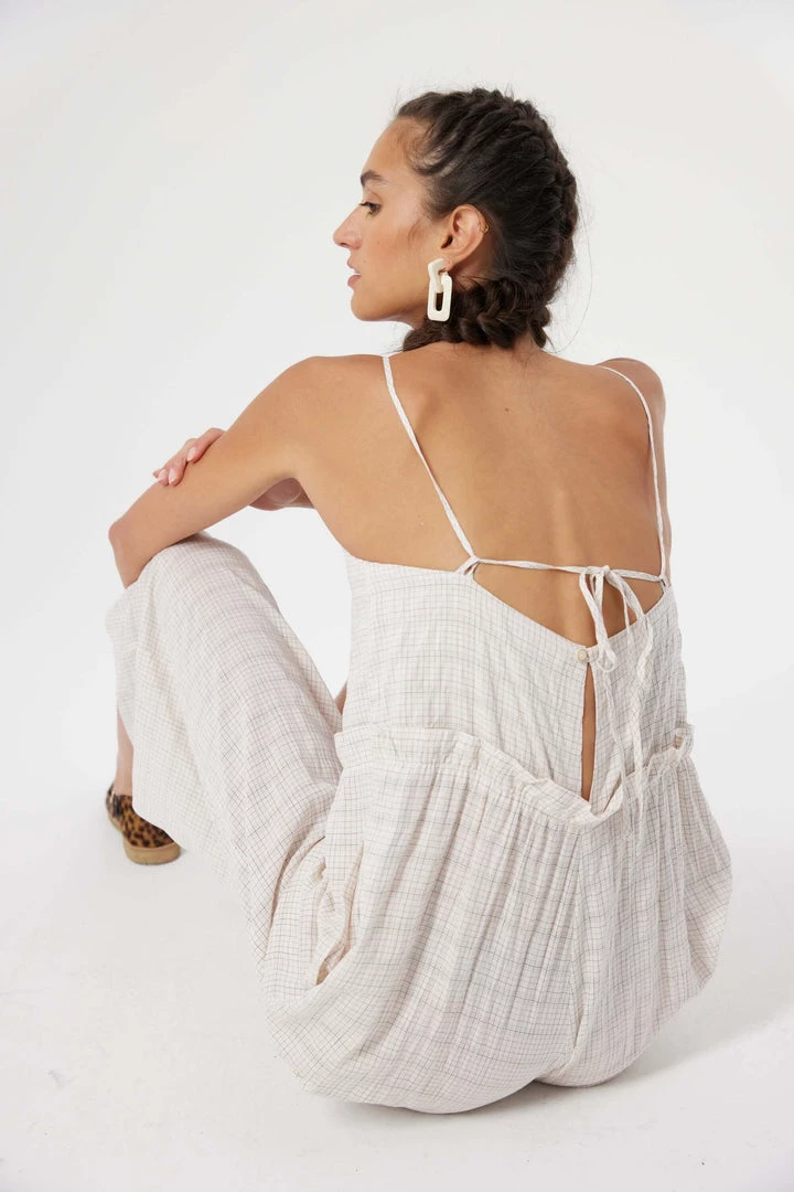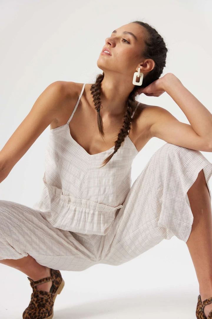Created from a fluid viscose, the Lottie jumpsuit has is declined in a Blues weave, patterned by a black grid, that is both romantic and modern. Lightly lined, it features a V-neck fitted bust and a ruffled empire waist, bringing comfort and elegance, all supported by a set of thin straps to tie in the back.