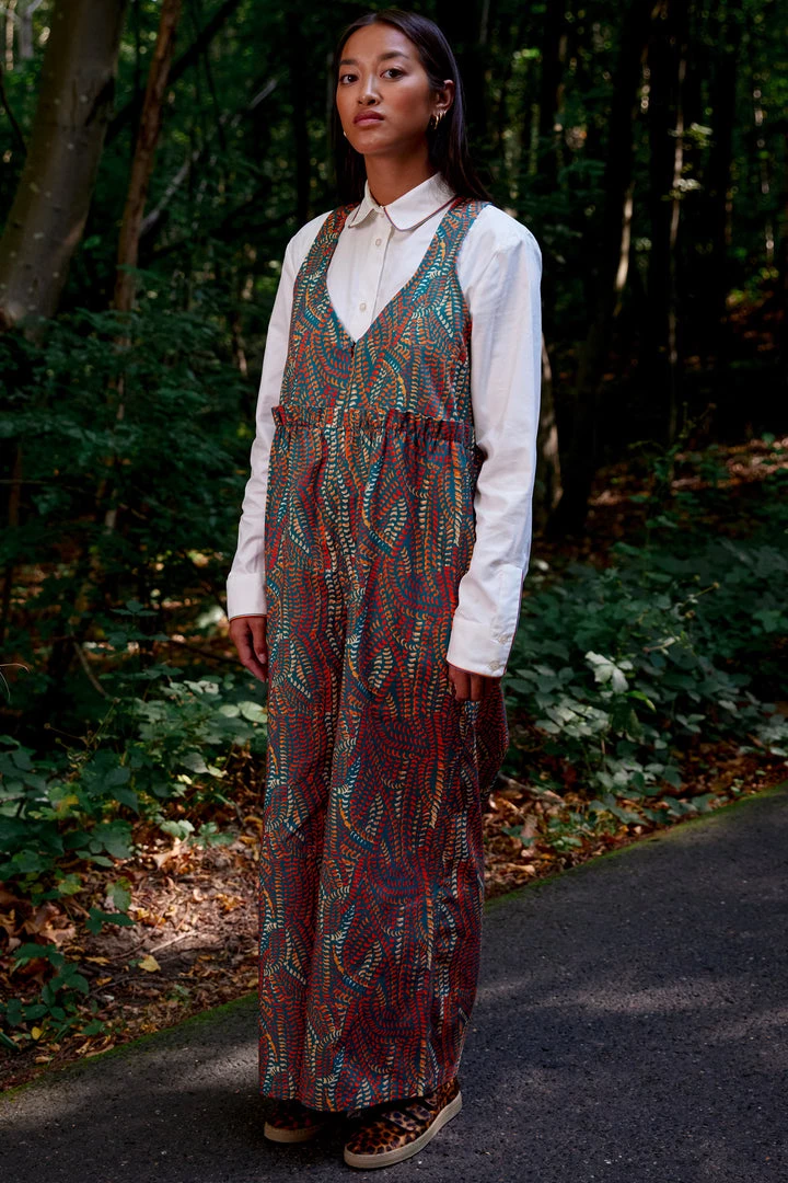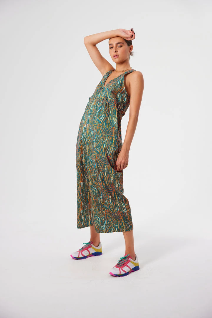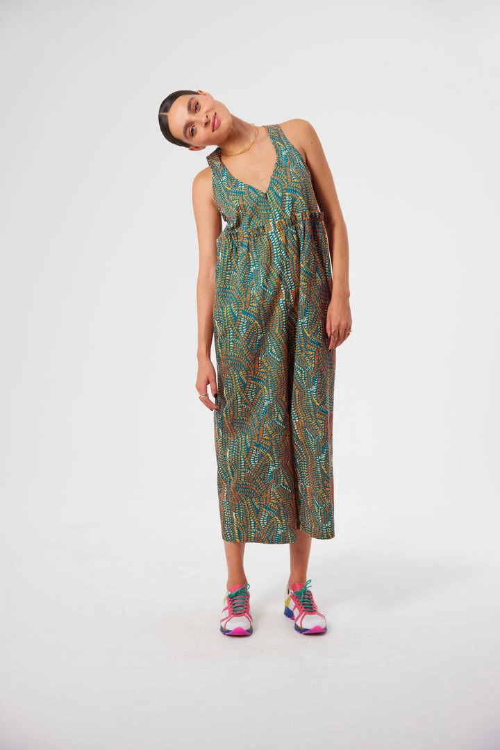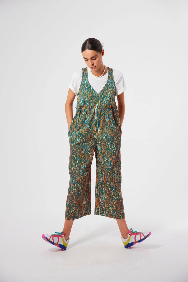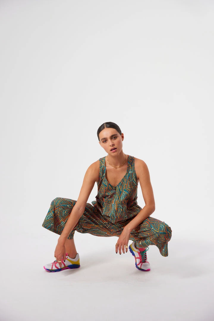 Crafted in a soft and structured cotton fabric, the Lottie jumpsuit is known for its empire fit and loose legs. It features a transparent zip closure in the front, a flattering V neck and a ruffled waistline. The matte touch of the fabric softens the strong and colourful Zicatela print that invades the whole piece.