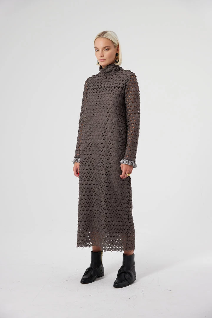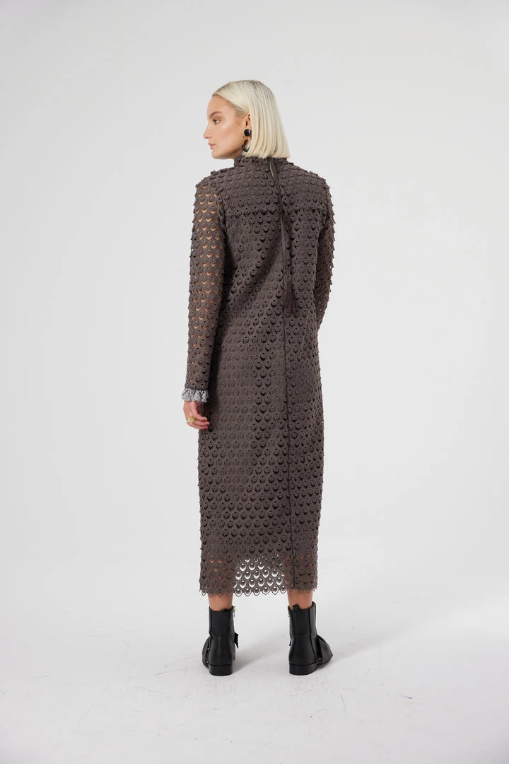 Timeless by its design, the Marshall dress slips on perfectly in this eclectic capsule. This long, straight dress is designed in a textured anthracite lace, with smoked sleeves revealing the Zinc lace. The marvellous work of the teardrops patterns is innovative, composed of a shining sun at the top of each pattern. Fitted from the top to the bottom, it lengthens your entire body and enhances the silhouette. Thanks to this thin and airy lace, the dress-up piece will become your favourite piece to wear for evenings.
