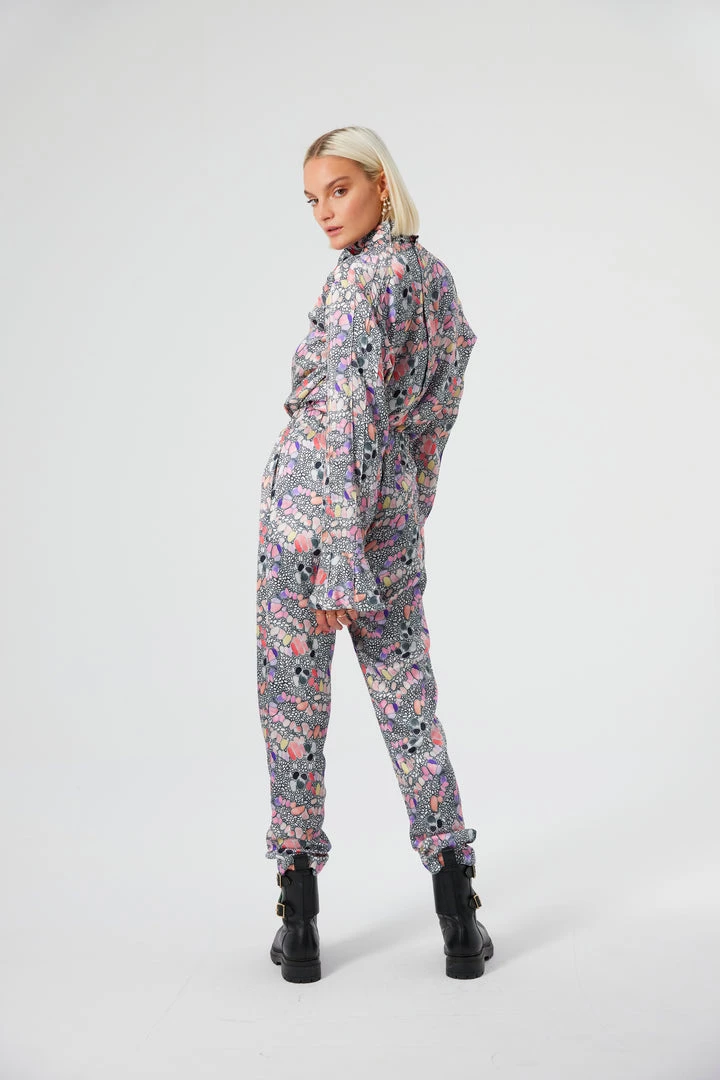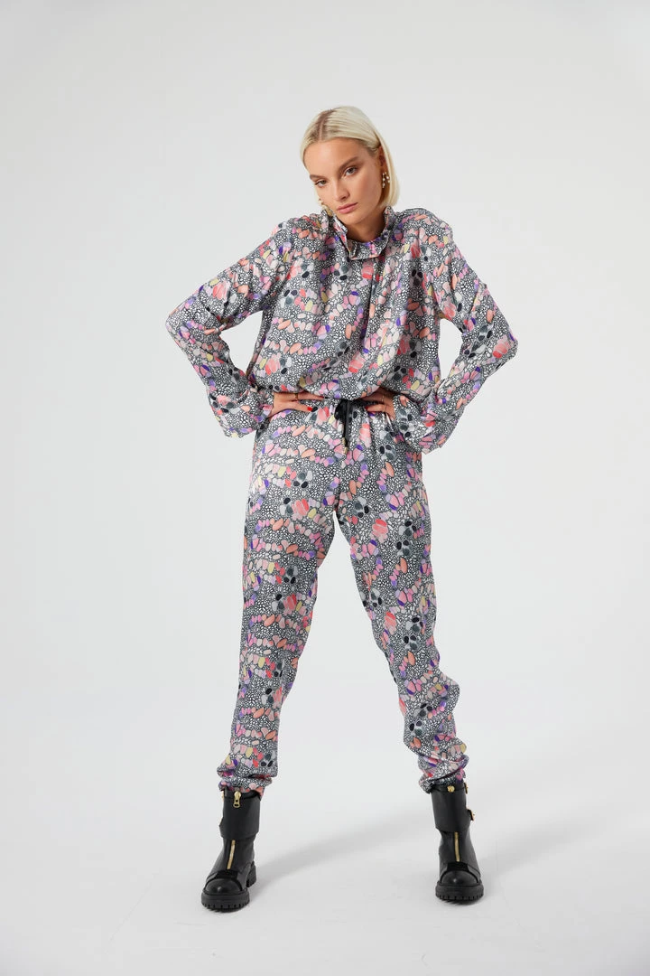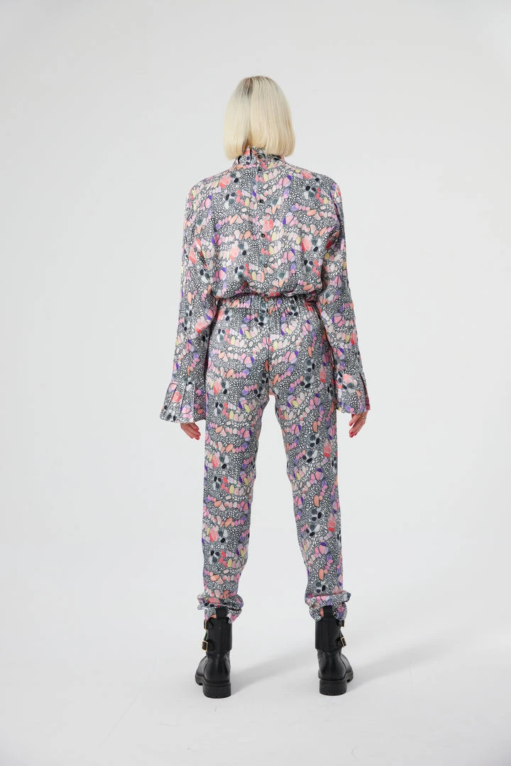 Inspired by the activewear pants, the Melchior pants have this straight and slim cut, pleasant to wear for its elegance. It features an elastic waist for maximum comfort. This harmonic Mochi print elevates the style of the pants with an anthology of pastel pebbles, dressing up your legs. The fabric chosen for the model is a smooth and slightly glossy textile.