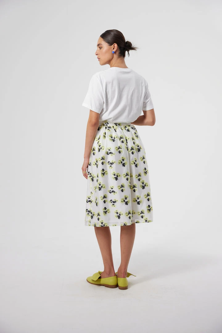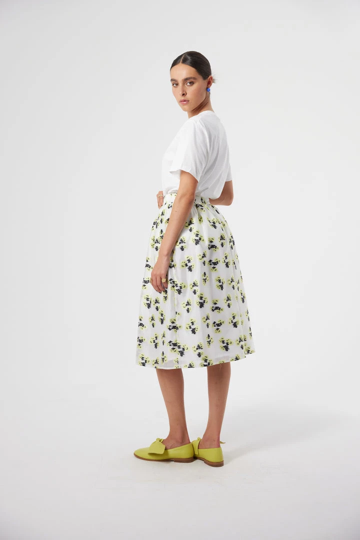 The Orso skirt is coming back made is with a white and cotton feel organza with plenty of embroidered yellow flying dandelions. Slightly structured and voluminous because of the lining, this piece wraps with grace and elegance your legs. A vaporious cut and comfortable touch for any of your outfits.