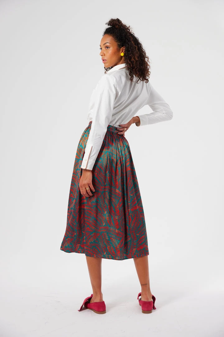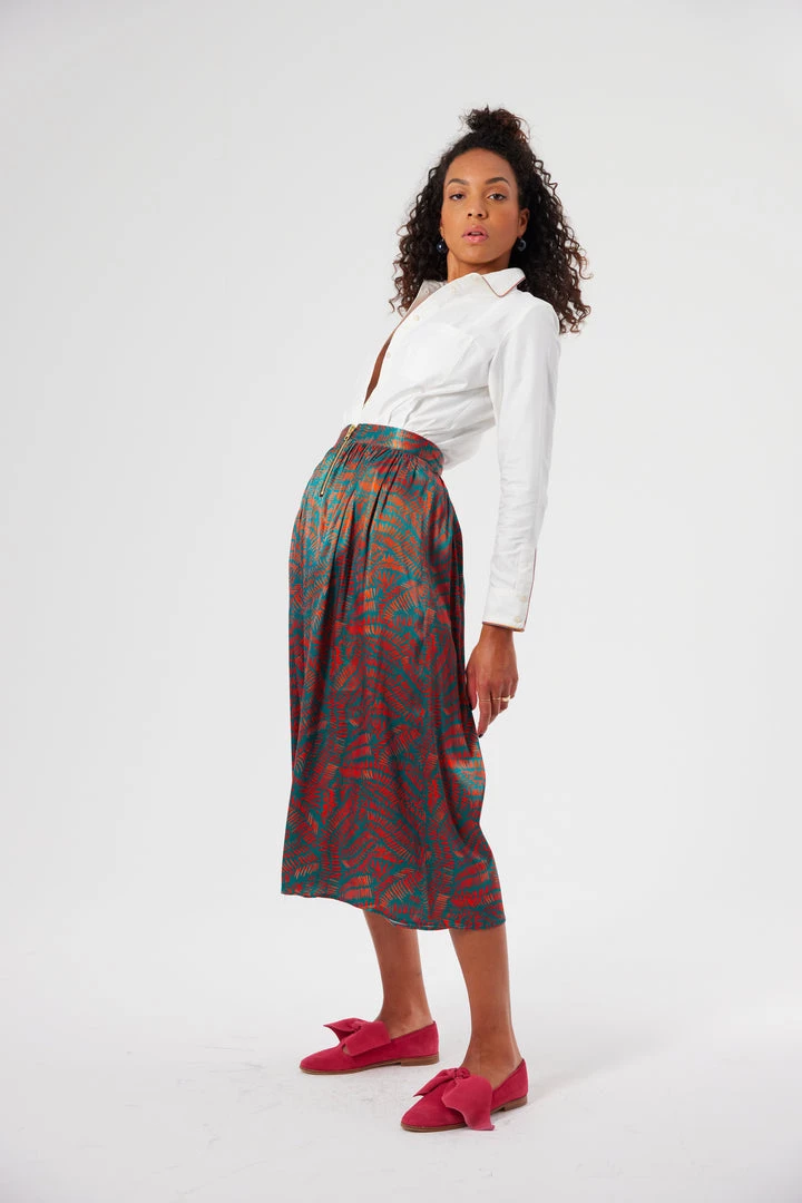 Made in viscose, this A-line Orso skirt pops up with the organic and satin Palmera print. It features a golden zip, a fitted waist and pleaded details. The fabric is vaporous with a flowing and heavy fall.