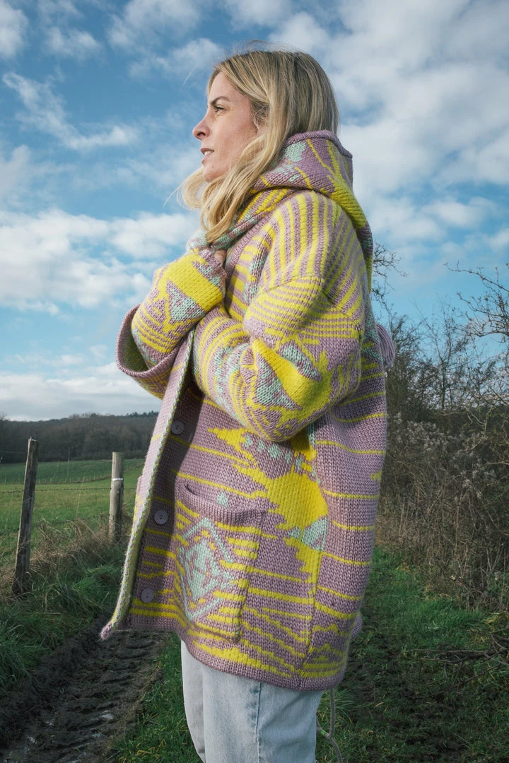 Here is the Rufus Cardigan, new model from the Heimstone collection. Heimstone design a new model to keep you warm and stylish this Autumn. This piece is a large and oversize knit cardigan made in the Yellostone knits. Three bold and colorful wool knitted in a ethnic patern. The cardigan is made of a heavy and thick knit that will envelope your body to bring you absolute comfort while keeping you warm this season.