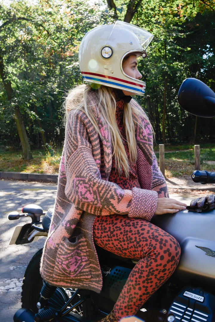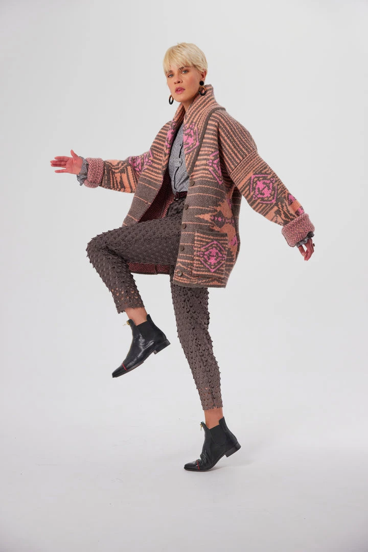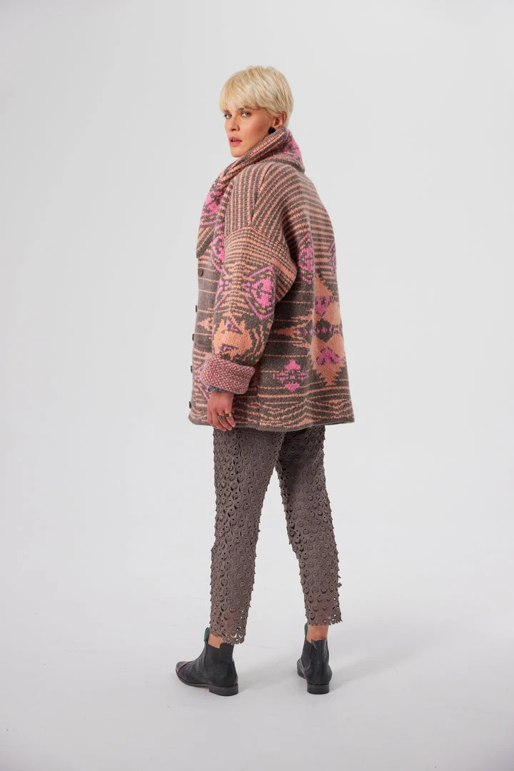 Stay warm and stylish with our Rufus Cardigan in Yellowstone knit. This chunky piece is a large knit cardigan made in wool and cotton, perfect when bracing for the cold. The colours chosen here, a trio of taupe, peach and pink delicate shades, portray with a subtle touch the unpredictable weather of Paris. Three bold and colourful wool knitted in an ethnic pattern. The cardigan has long sleeves that covers abundantly your arms and hands.