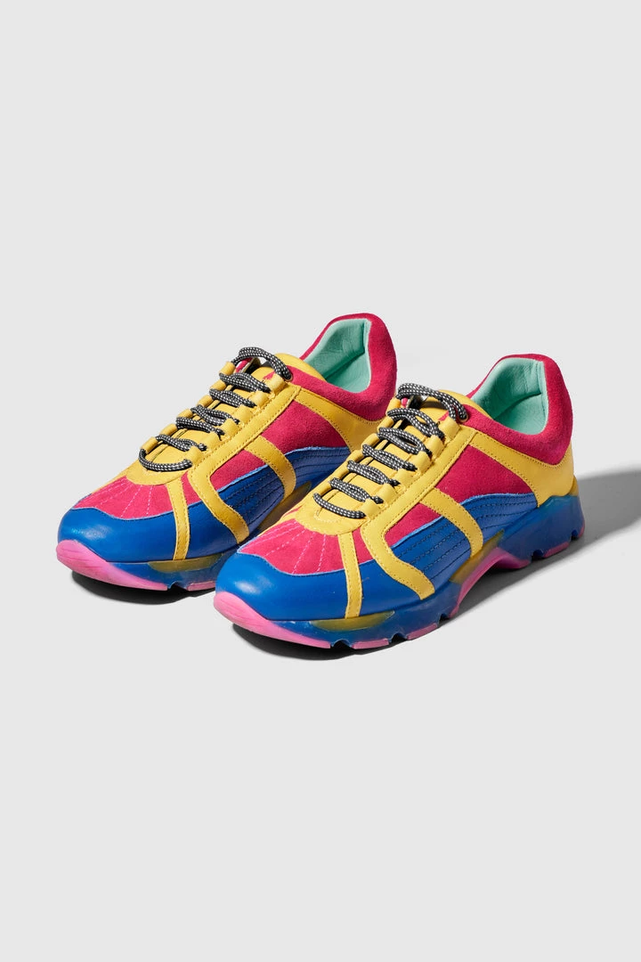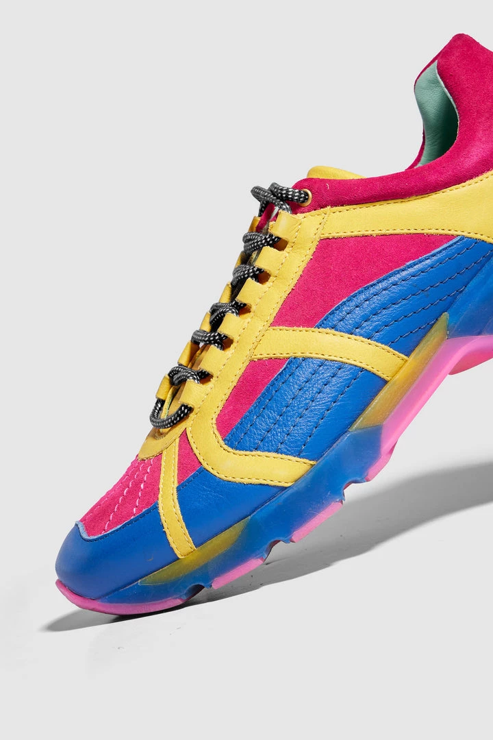 Casual and sporty : Meet our new running shoes. Those shoes reflect perfectly Cuba : heat and joy in a trio of yellow, bleu and fuchsia. Made in leather and suede, it has a thick silicone sole that makes it the shoes comfortable. These shoes run with details and distinguit themselves by the complemetary association of colours, making them stylish and urban shoes.