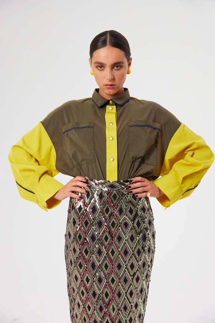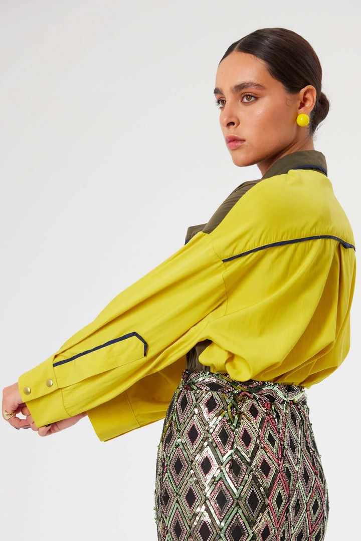 Enjoy our Astrée shirt in Wave canvas. This sporty and athletic shirt combined with this yellow and khaki duo add this casual and exotic Caribbean vibe. Made in this innovative and fluid fabric, our Astrée slightly covers your body, compatible with the heat of summer. The piece has an oversize and casual cut, making it easy to style.