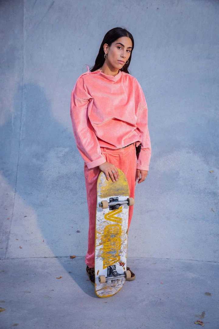Meet the sweetest of our sweaters, our new Bobbi sweater. Made in a soft and luminous pink, the corduroy fabric adds texture, bringing it up to date the charm of the velvet, fierceness. Combining low-fitted shoulders and a loose bust, this piece mixes up comfort and style, with its easy-sided opening.