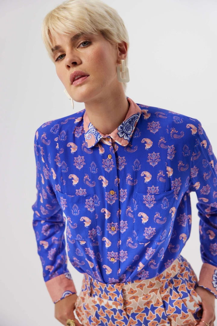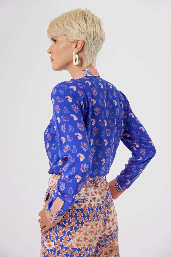 Manufactured in a soft and light viscose, the Dori shirt presents our rich Marahaja print, made in a pink cashmere pattern. It has this loose-cut with a finely structured collar and cuffs, bringing our three Jaipur prints to life.
