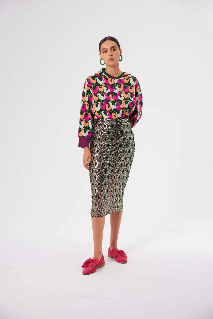 The Fox skirt in Jazz sequin is elegant and feminine. Lined in a black and light fabric, it helps the it lengthens your leg and will enhances beautifully your body. The pattern dresses up the piece, playing with light to change colours, echoing to the brigtheness and the festive side of Cuba.