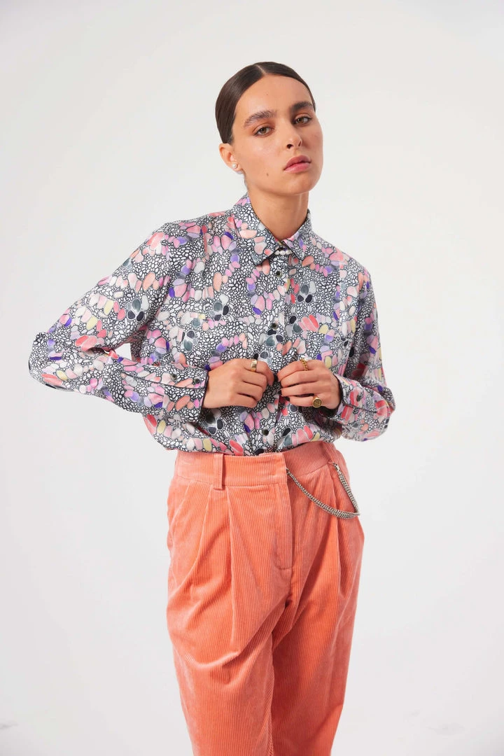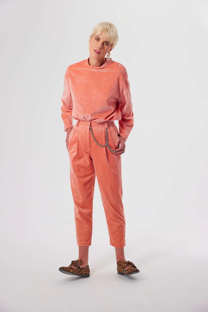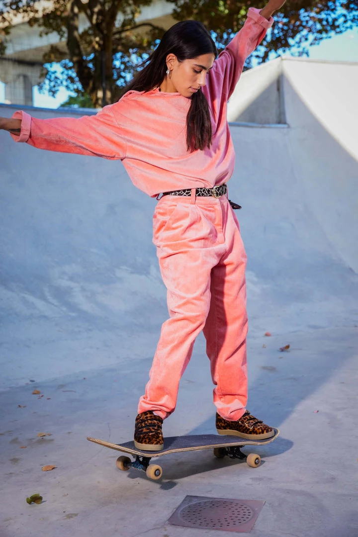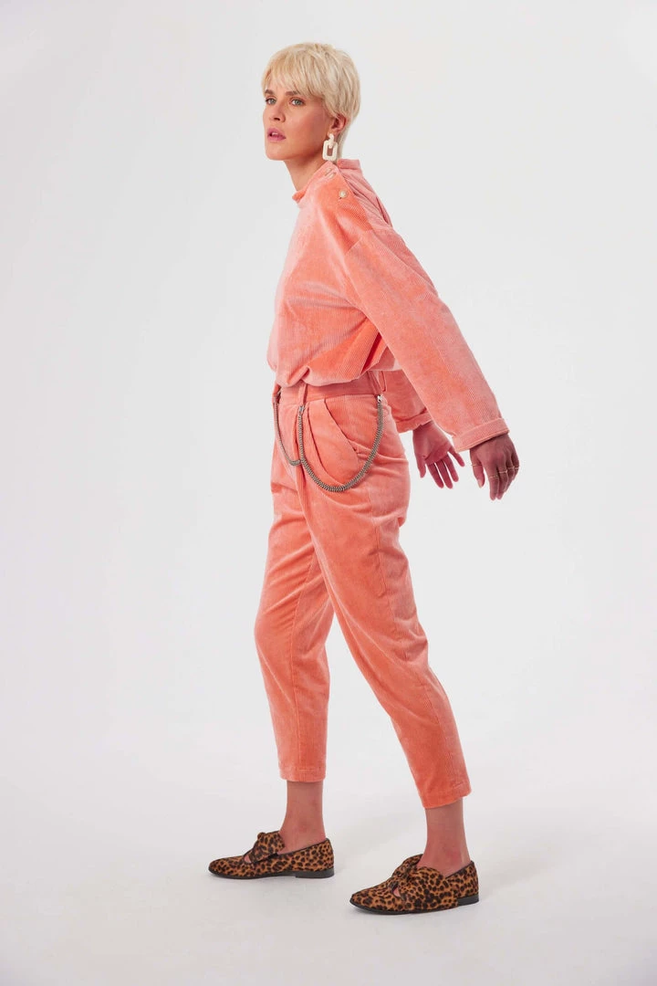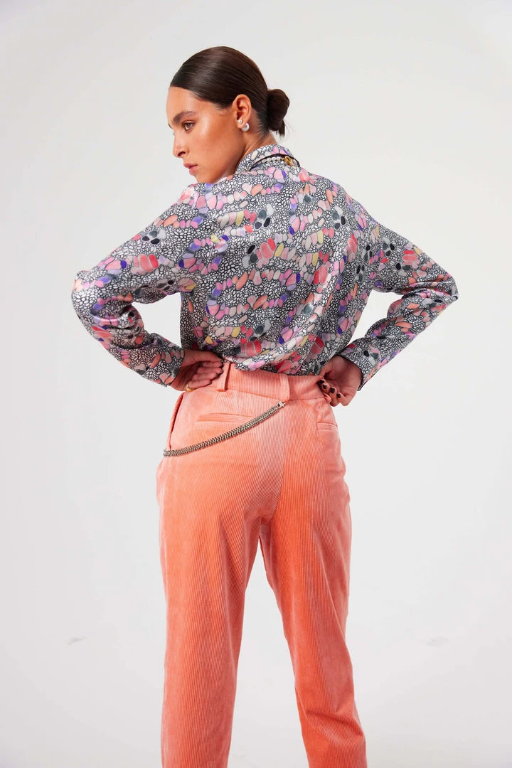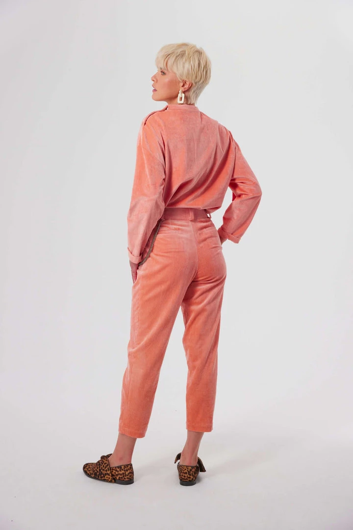 Find the softness of Sakura buds on our iconic Gabriel pants. Similar to tailored pants, they have that corduroy feel that softens the straight cut of the piece. It features a high waist belt that enhances your sihoulette. A tapered cut, thin and elegant, which can also be married with a blazer for a working suit or a printed top to bring character. The interior hooks makes it easy to close.