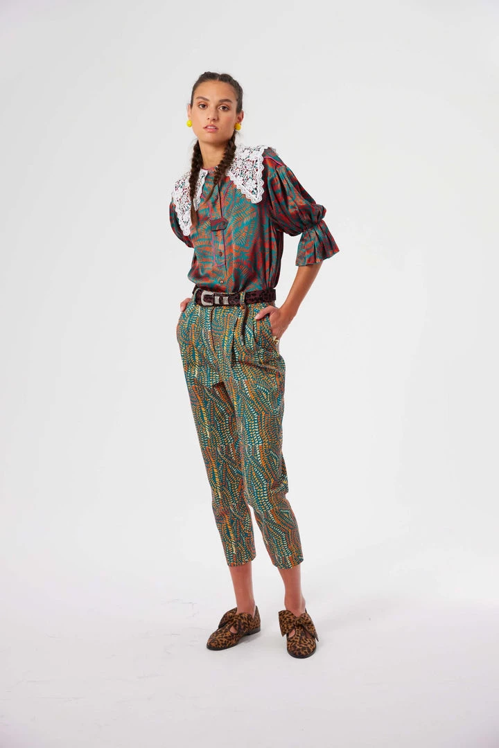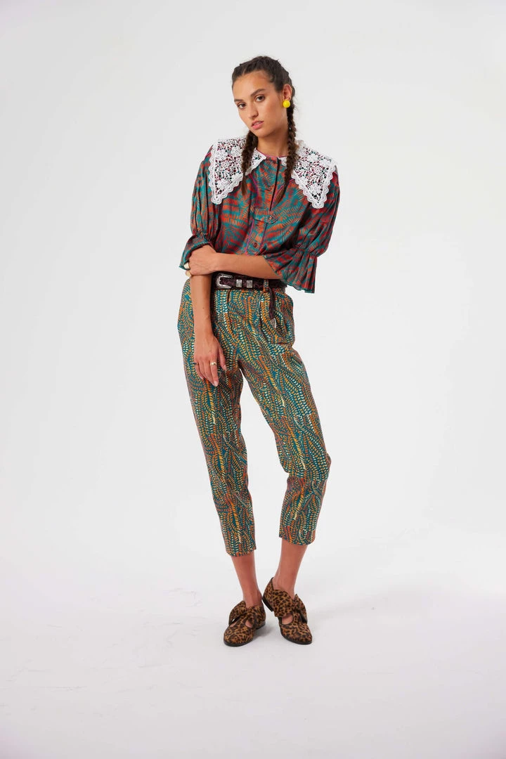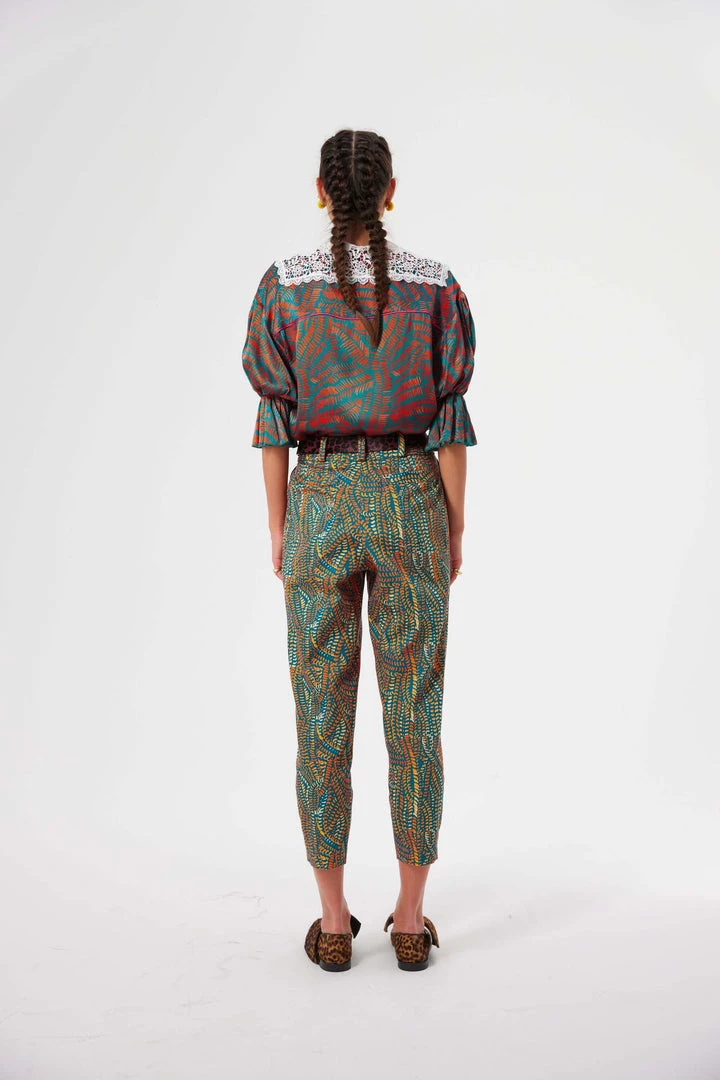 Manufactured in slick and structured cotton, these high-waisted and tailored pants have pleated details and a high waisted belt. They have three belt loops on the back, sided pockets in the front and the back and a matte finish that outshines the softness of the print and the structured cotton canvas fabric.