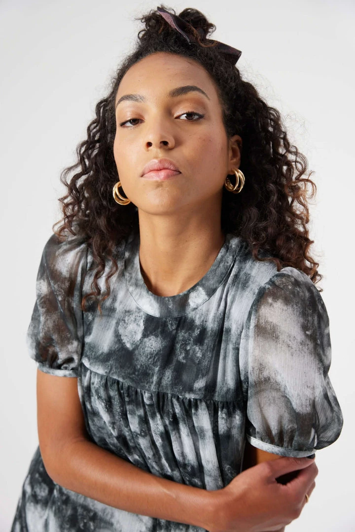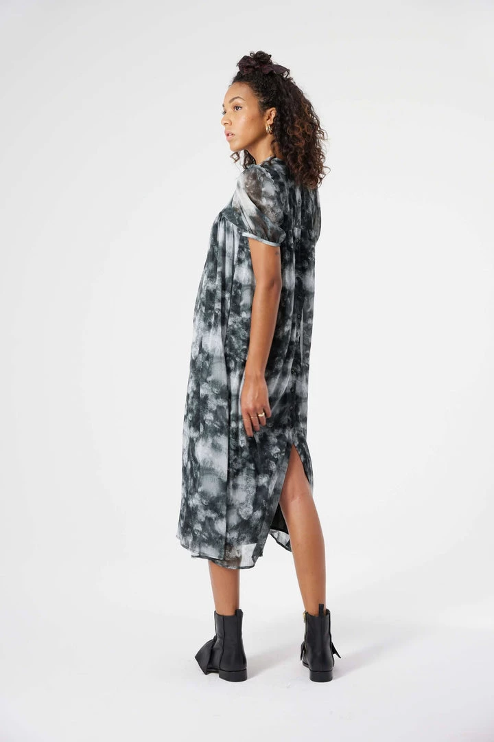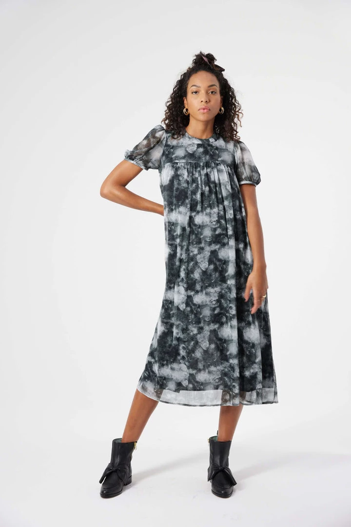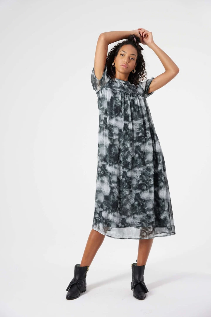 Inspired from a children’s dress with its puffed sleeves, the Gaya dress ties feminity and simplicity. Designed in a vaporous fabric with a matte finish, its loose and long cut stands with its flowing and delicate fall. The print has an impressive momentum thanks to its airy and thin drape, allowing the print to stand out more. The transparency is softened by the grey lining underneath, added to keep you warm.