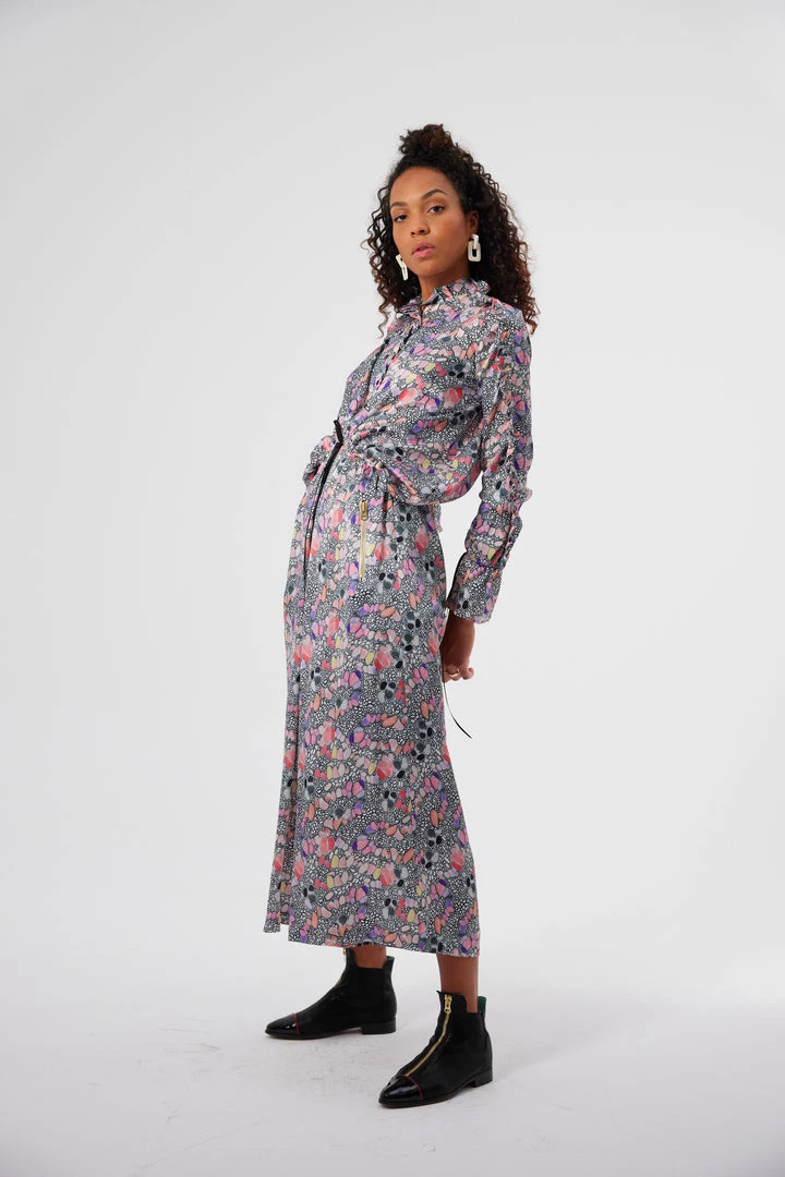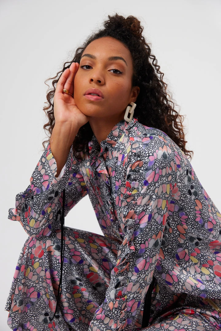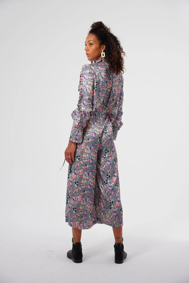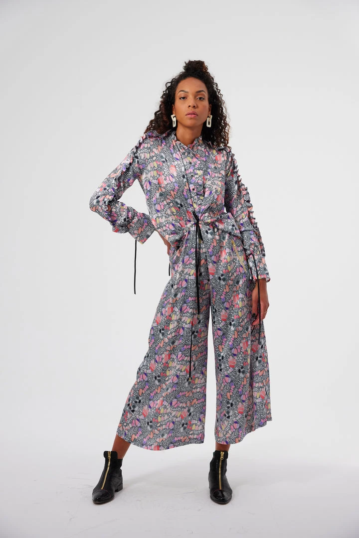 Wear our stylish and confortable Gil jumpsuit. Inspired by the culotte-skirt, this singular one-piece features Japanese aesthetics with the Mochi print. The platehora of watercolors plays with a painted pencil of black surroundigs, adding up a fluid movement to the piece itself. Along this piece, series of ruffles that giving an impressive and structured volume to the top of the piece while having a fluid bottom.