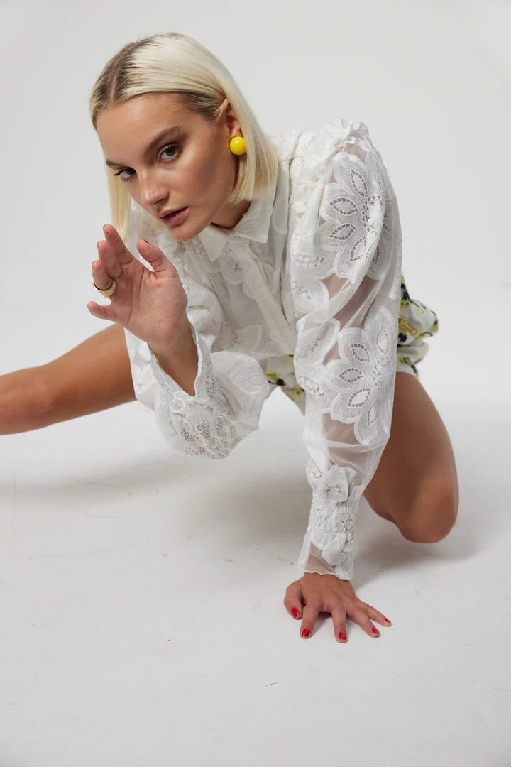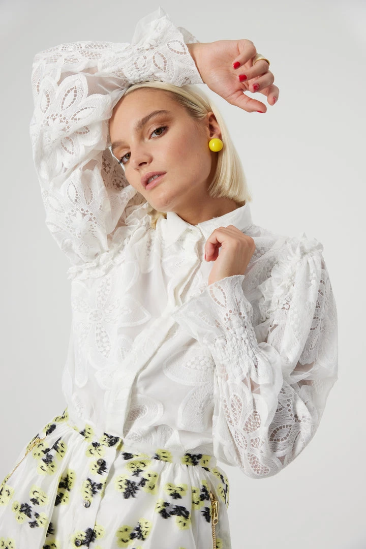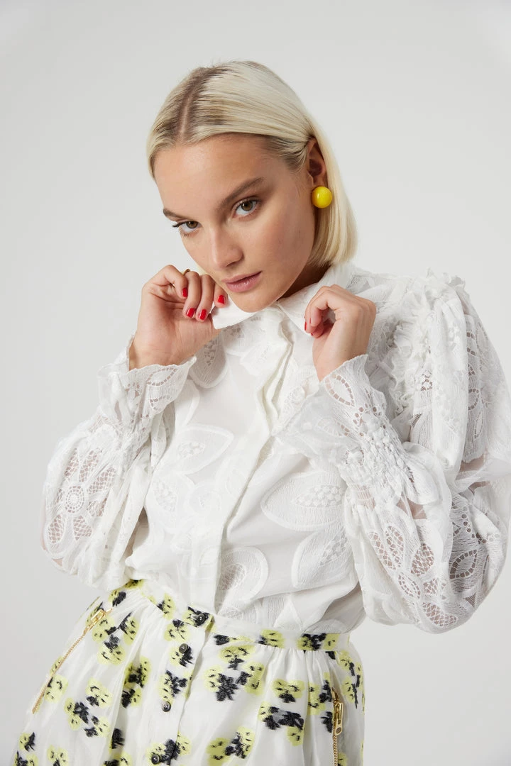 Add a vaporous touch to your wardrobe with the Imogen shirt in Fantasy. Made of an elaborated and strench tulle, the embroideries details and beauty will be appreciated. Find the delicate cloudy sleeves with smocked wrists and florewered ruffles on the shoulders that make this piece unique.