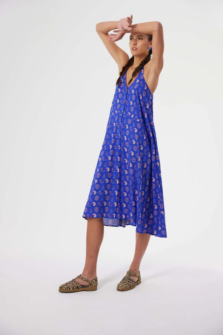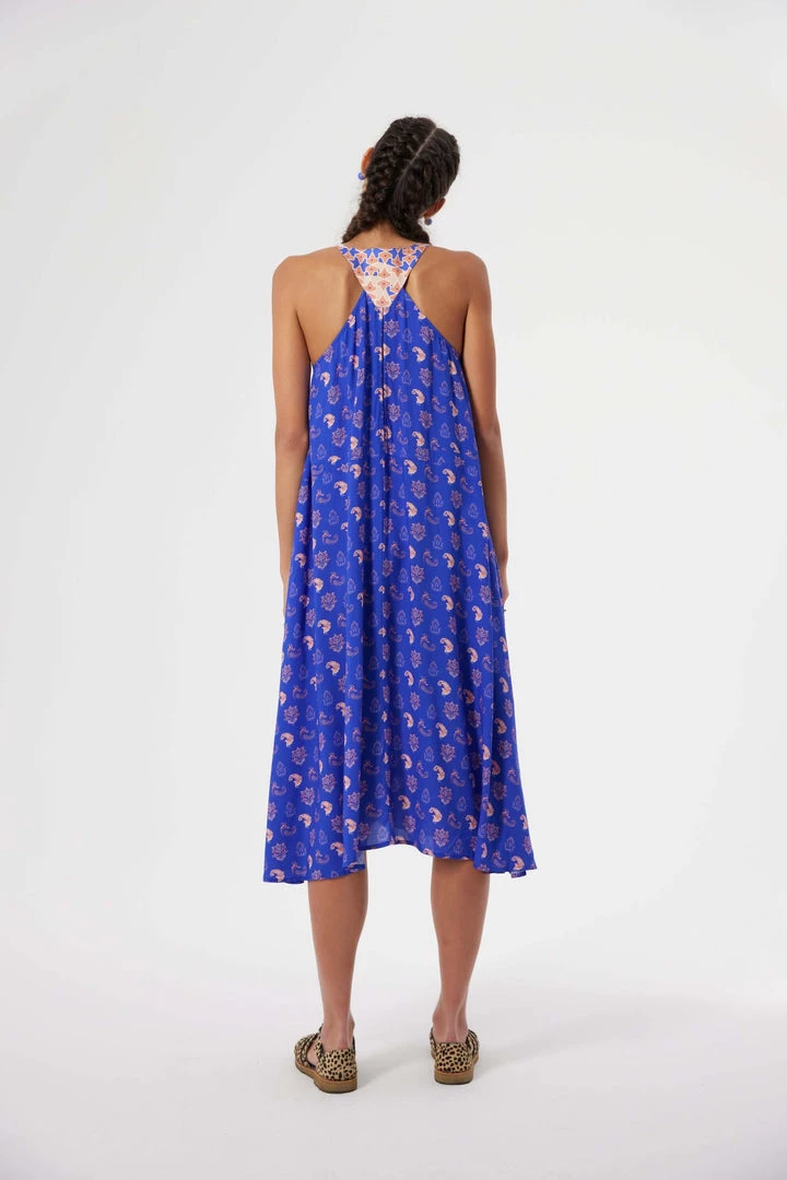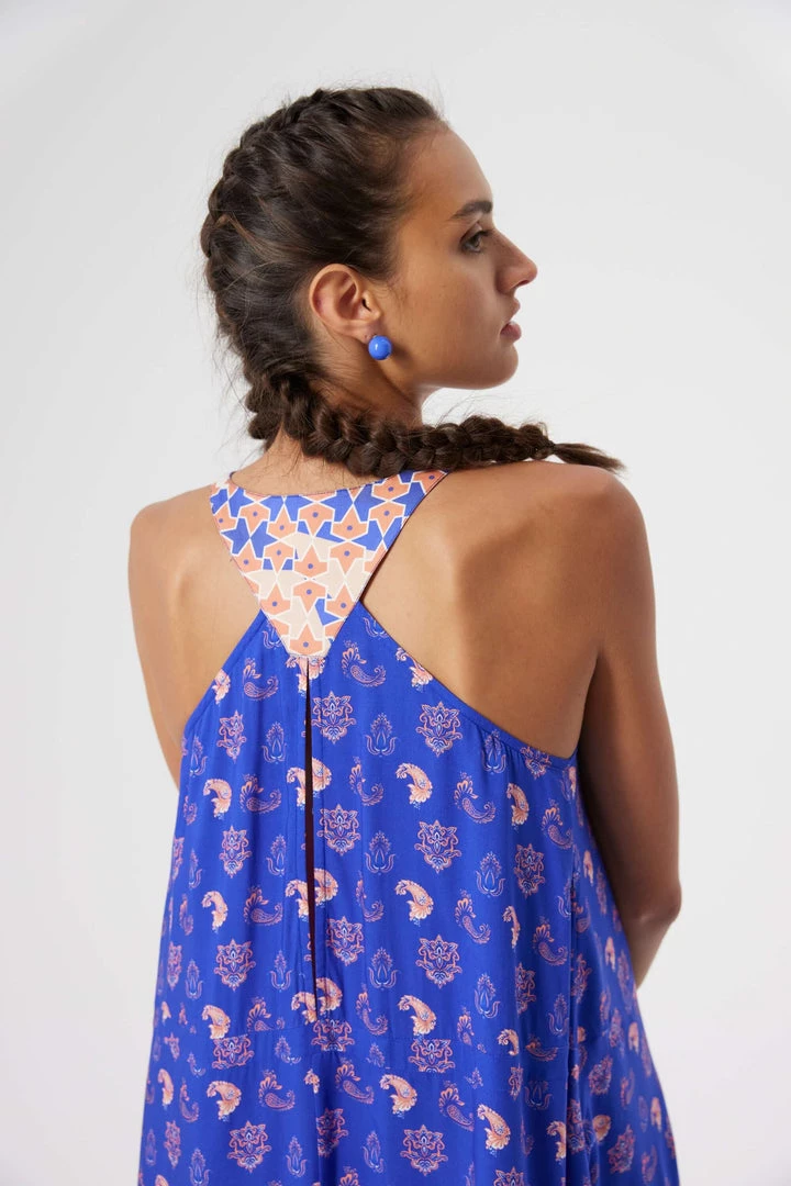 Crafted in soft blue viscose, the Java dress is an easy-to-wear piece that reveals fearless for the sun with its sleeveless version. A V neckline to enhance your chest, a set of thin straps with an interesting Mosaic yoke at the back.Â