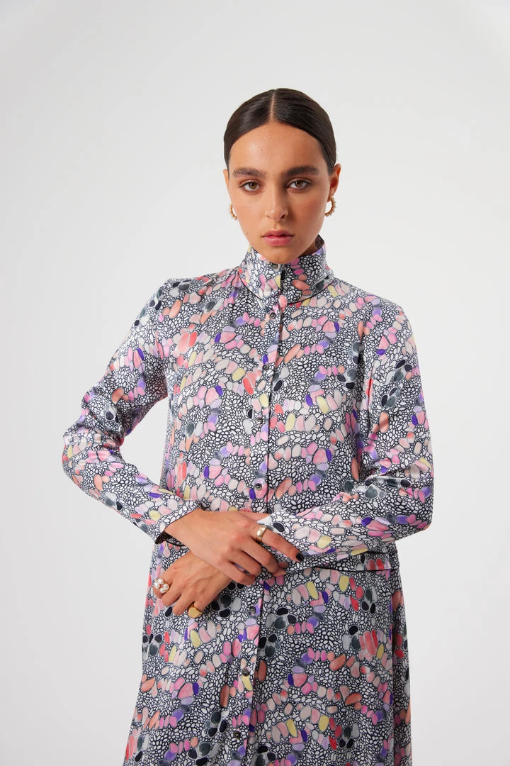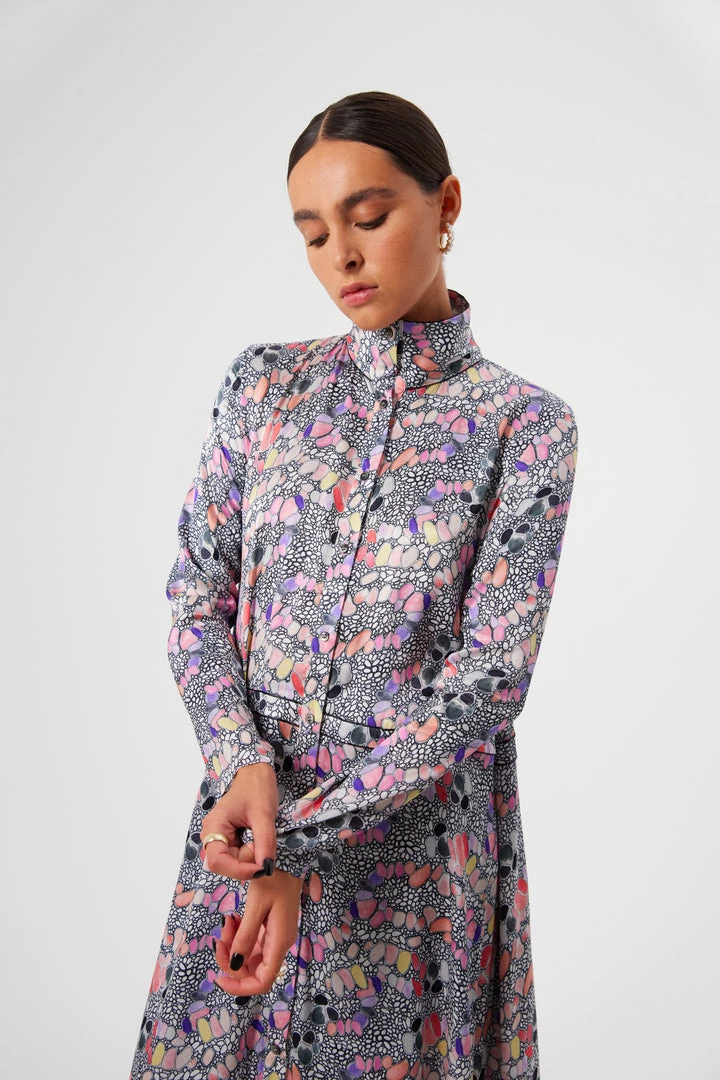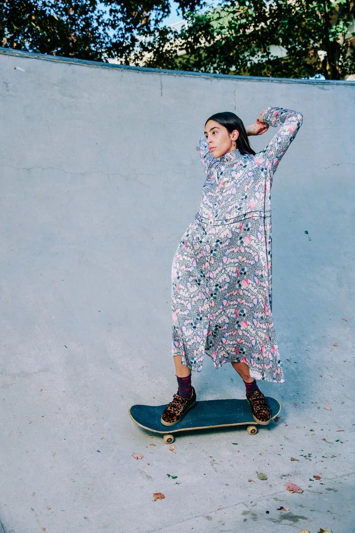 Let yourself be carried away by the lightness of the Java dress that opens the ball of our Tokyo capsule. Proudly displaying its long sleeves and its high and thin turtleneck, it proudly wears the colors of our kawaii inspired Mochi print. It is vaporous, skater-like and very comfortable to the touch. Fitted at the bust and flared at the bottom, the Java dress is suitable for all body types. Made in a fluid and dense fabric, it has a satin finish, which makes it the perfect piece with a romantic but casual look.
