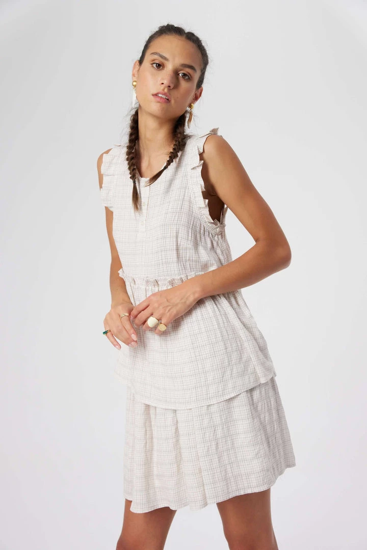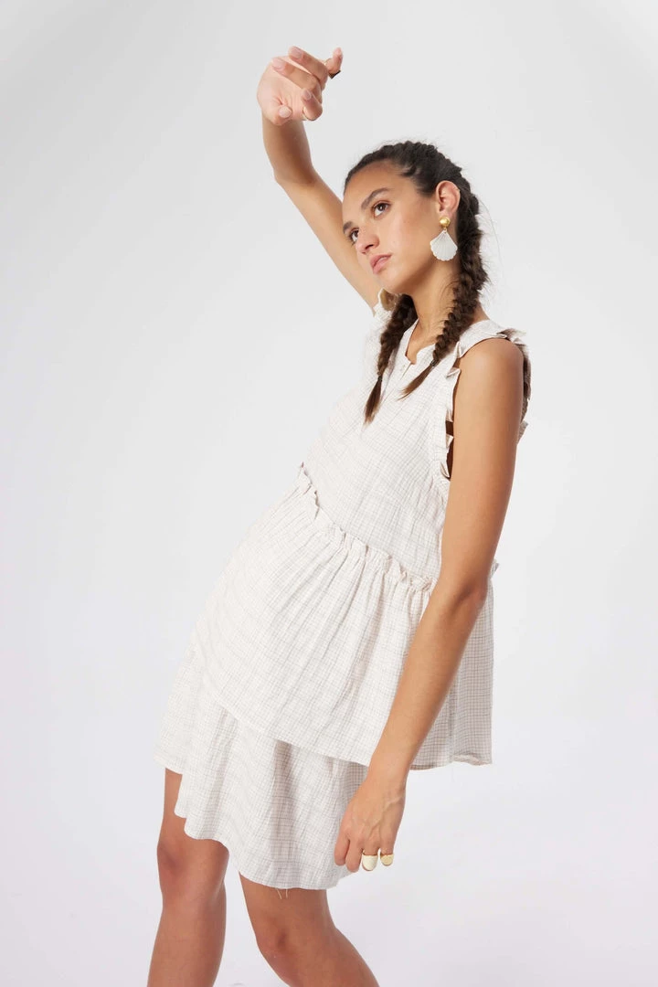 The Kaya blouse is a romantic top, with ruffles on the shoulders and waist. Designed in a plaid fabric, it delicately dresses your bust and has an asymmetrical cut that lengthens your silhouette. Easy to wear, it will replace your tops for the summer.