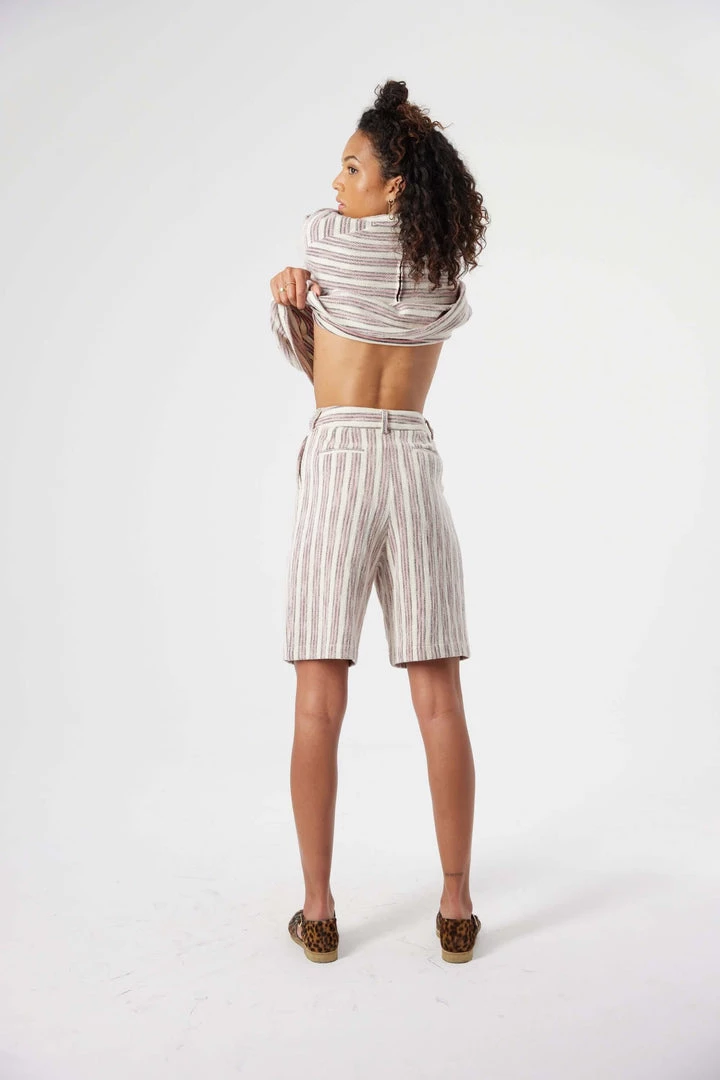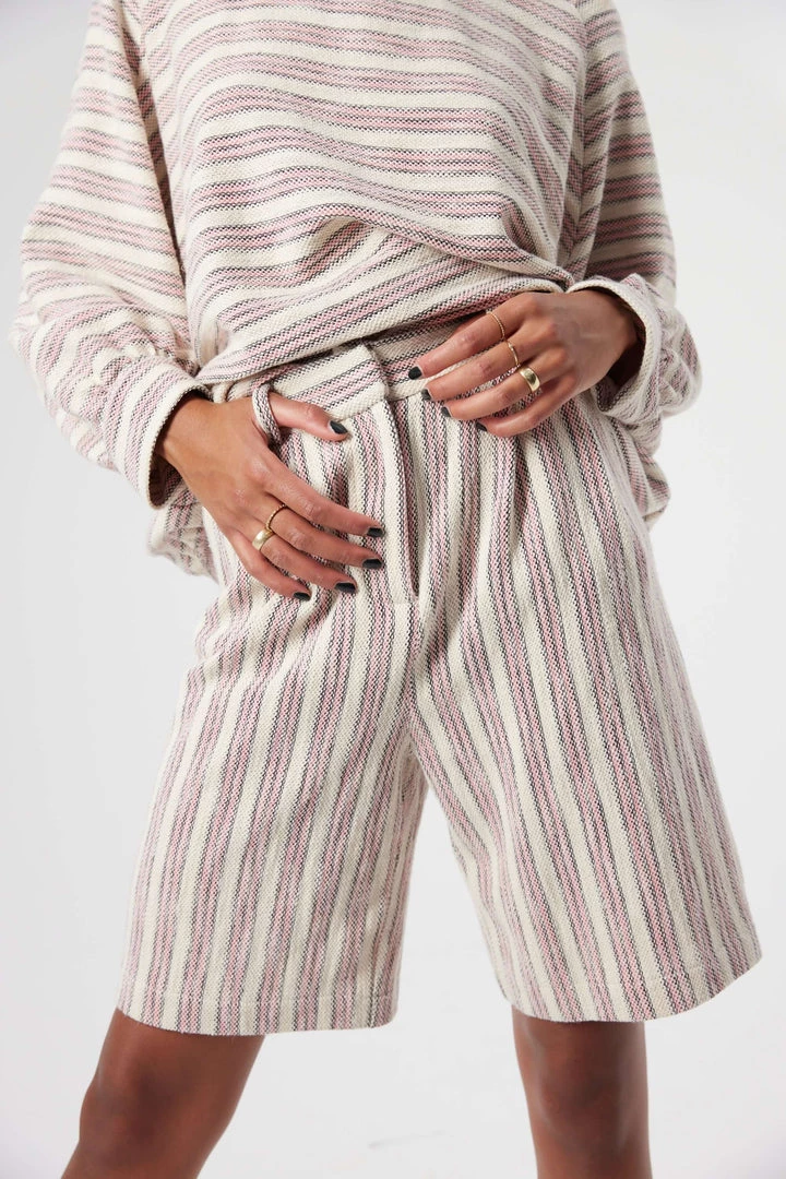 Loyal companion to the Brooklyn jumper, the Moor Bermuda comes out in a weave of an ecru and pink stripes. Inspired by men’s bermuda shorts, it is a pleated piece with a flared cut that gives your legs a stylish look. The ecletism mix of plant materials brings out the summer side and gives to it that soft and consistent feel.