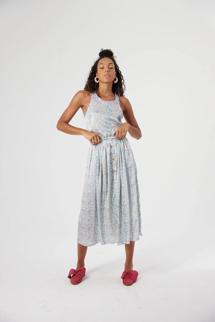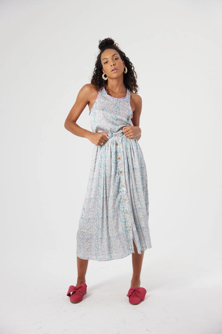 Crafted in a flowing fabric, this long and buttoned Orso skirt embraces the translucent blue Lagoon print. It is buttoned at the front and fitted at the waist with pleats