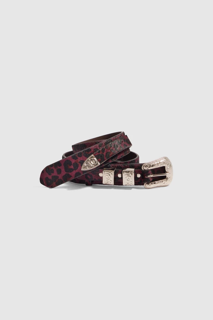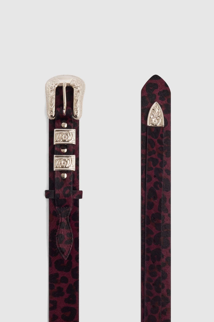 Welcome to our new Texan belt in burgundy Leopard printed leather. It has a refined and sophisticated design thanks to its silver buckles and silver tip giving an edgy look to it. The engraving details praise the American definition of elegance. Wear these rustic belts for a vintage and discreet look and to complement your style.